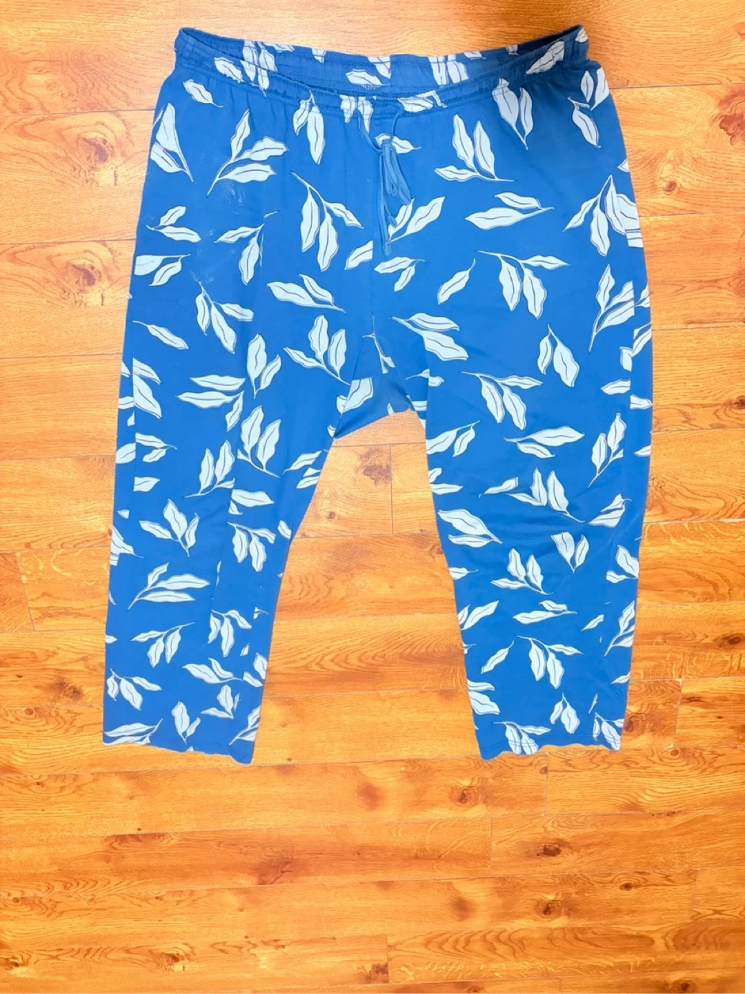 Comfy blue pajama pants with a white leaf pattern. These pants feature a drawstring waist for an adjustable fit. Made with a soft fabric for relaxing. Suitable for lounging at home.