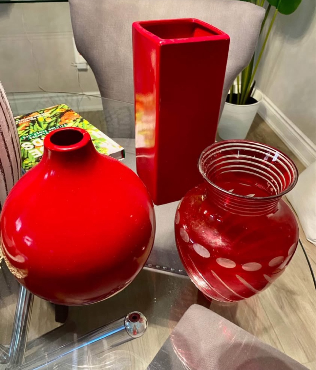 Selling a set of three red decorative vases. They add a pop of colour and a touch of modern flair to any room. Great for displaying flowers or simply as standalone art pieces!