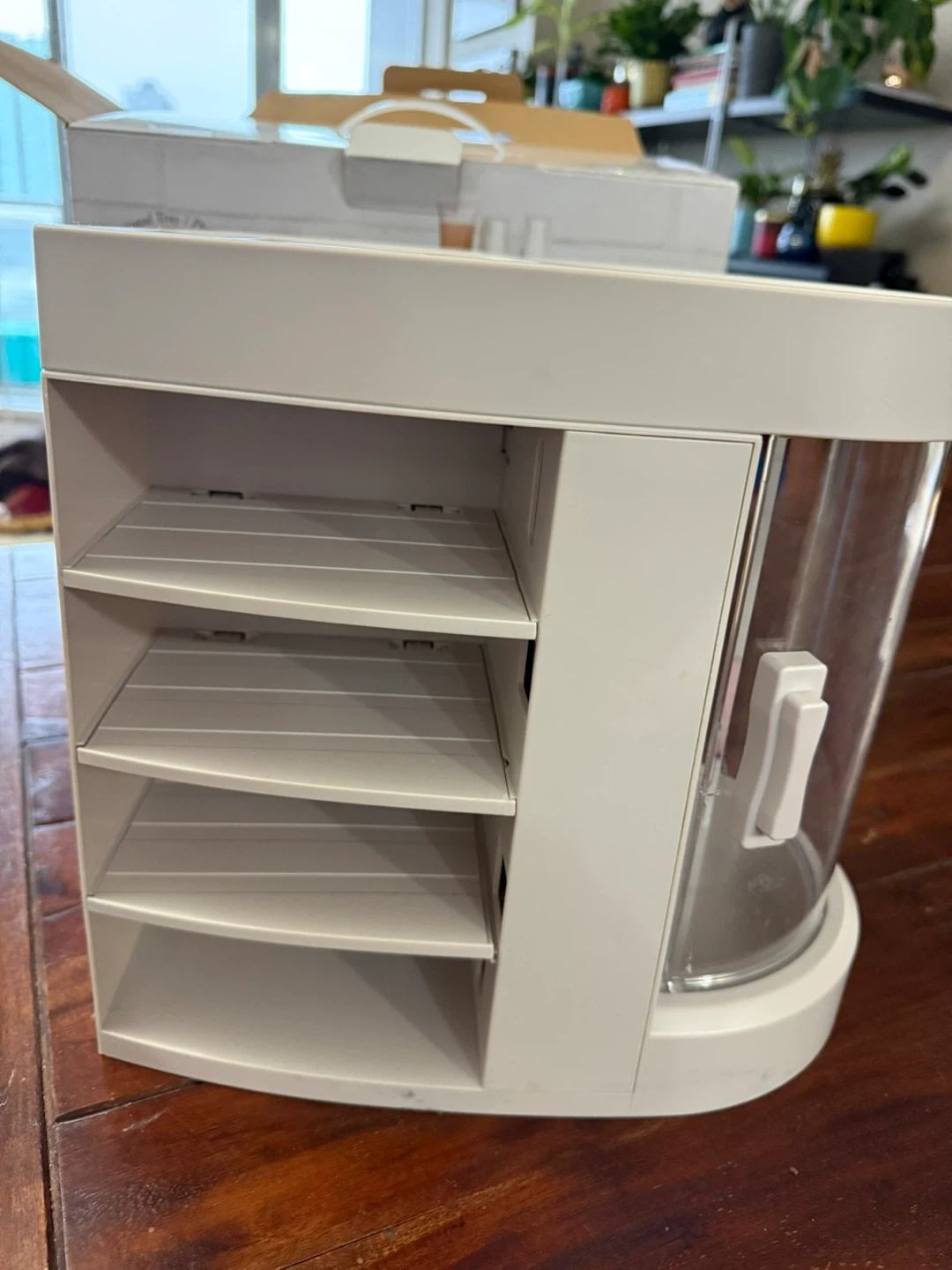This Thinkspace Beauty organizer tray is designed for convenient storage and organization. It features four drawers and a clear retractable window. It's perfect for keeping your makeup and beauty products tidy.