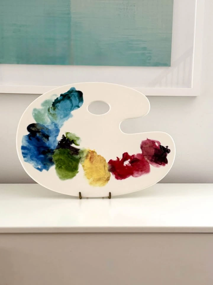 Add a splash of color to your next gathering with this Fishs Eddy Artist Palette Cheese Plate. Designed to look like a real painter's palette with vibrant watercolor "paint" splatters, this ceramic tray is perfect for charcuterie, appetizers, or as a unique decor piece for your kitchen or studio.
