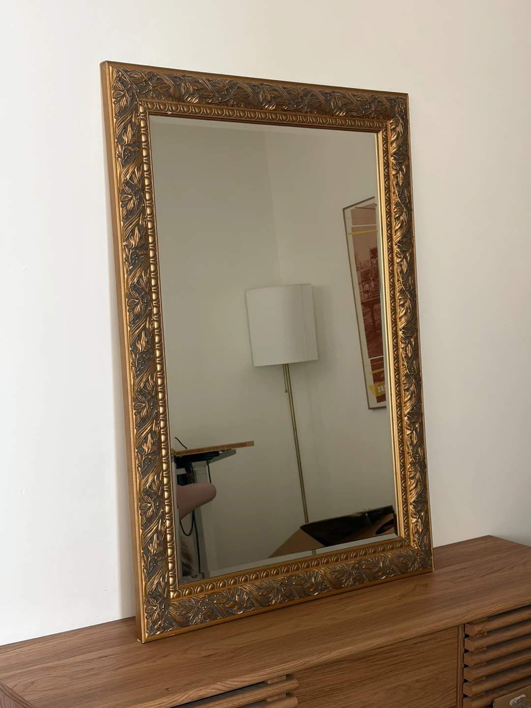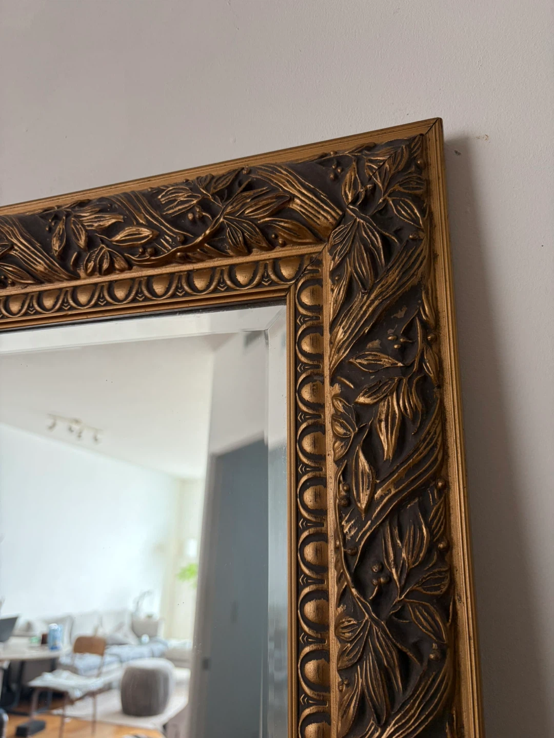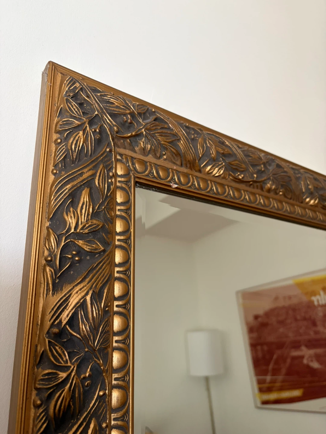 Beautiful baroque-style accent mirror. Carved wood frame. Pre-loved condition (small nick as noted in photos) but still in good shape! 42.5 inches tall. 30.5 inches wide.