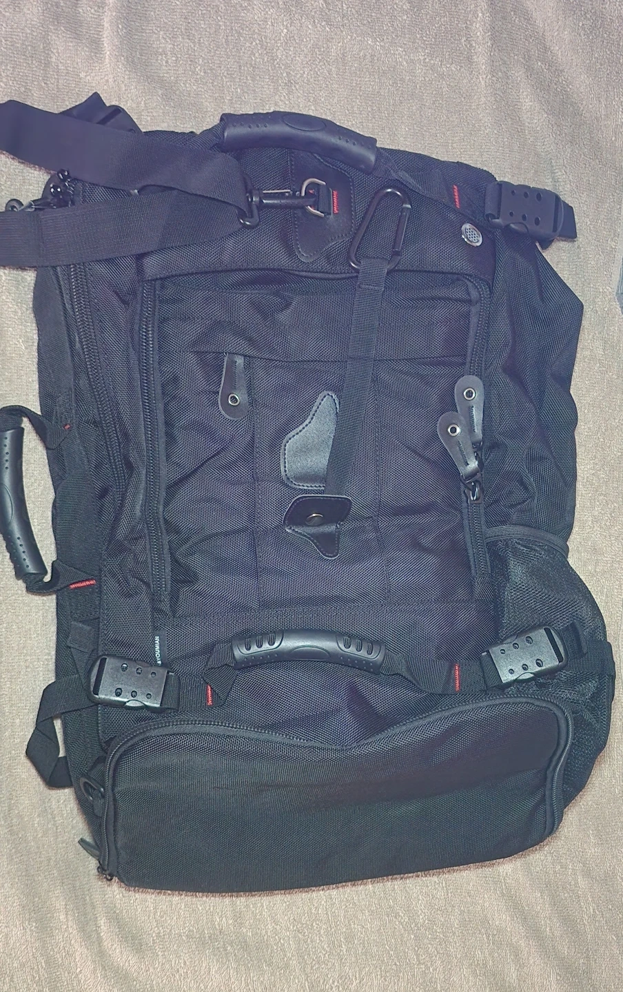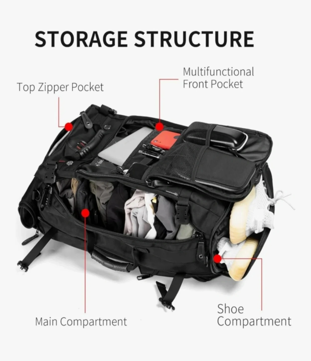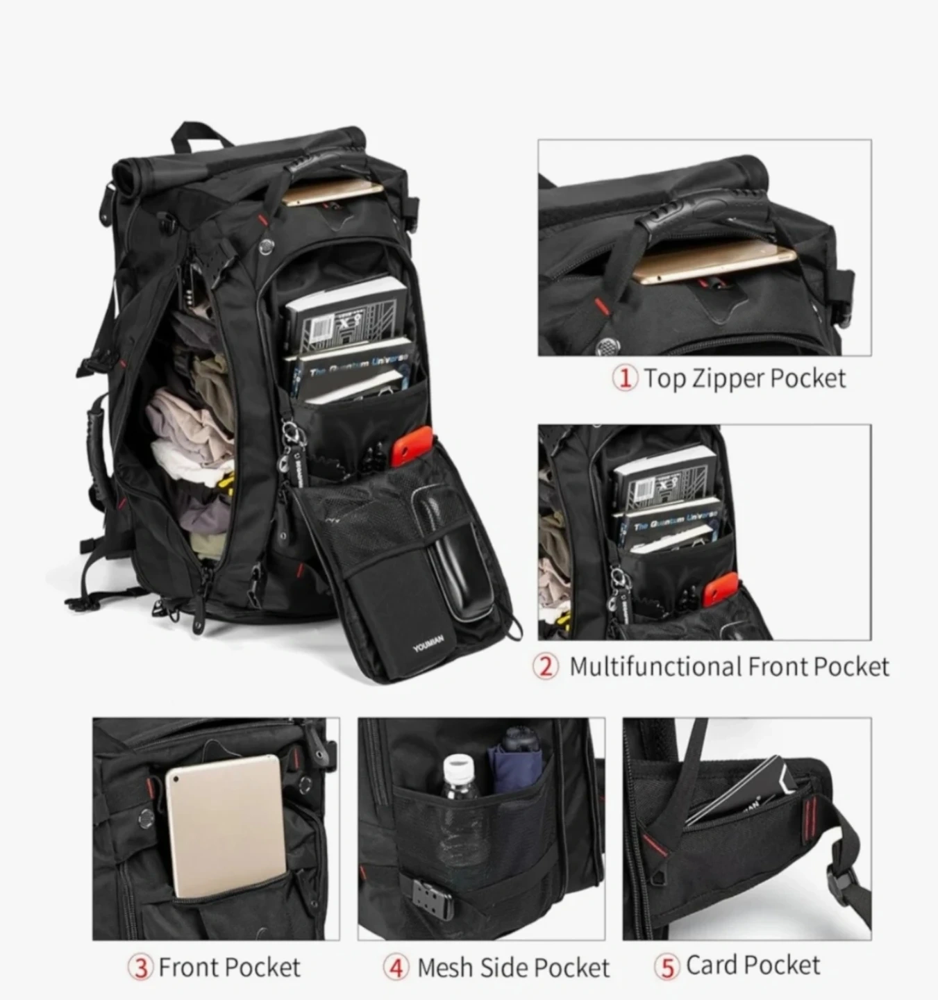 selling a YOUMIAN carry-on travel backpack in black! It's a durable convertible duffle bag, perfect for hiking, airplane travel, and more. It fits a 15.6-inch laptop and has multiple ways to use it, with extendable storage. Lots of compartments to keep everything organized!
