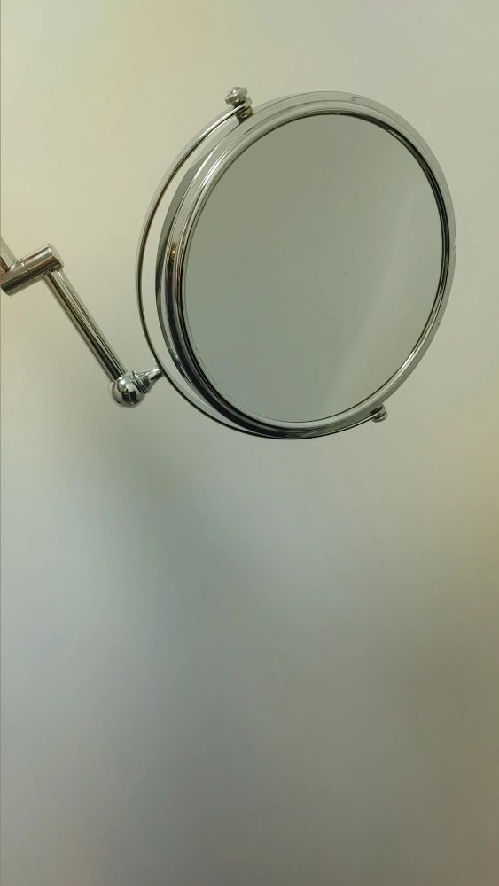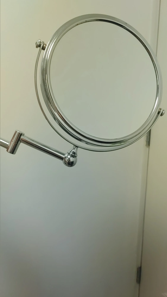This wall-mounted vanity mirror features a chrome finish and a convenient swivel arm for adjustable positioning. The mirror has a round face and a sturdy metal construction.