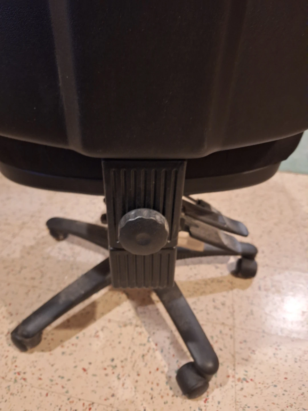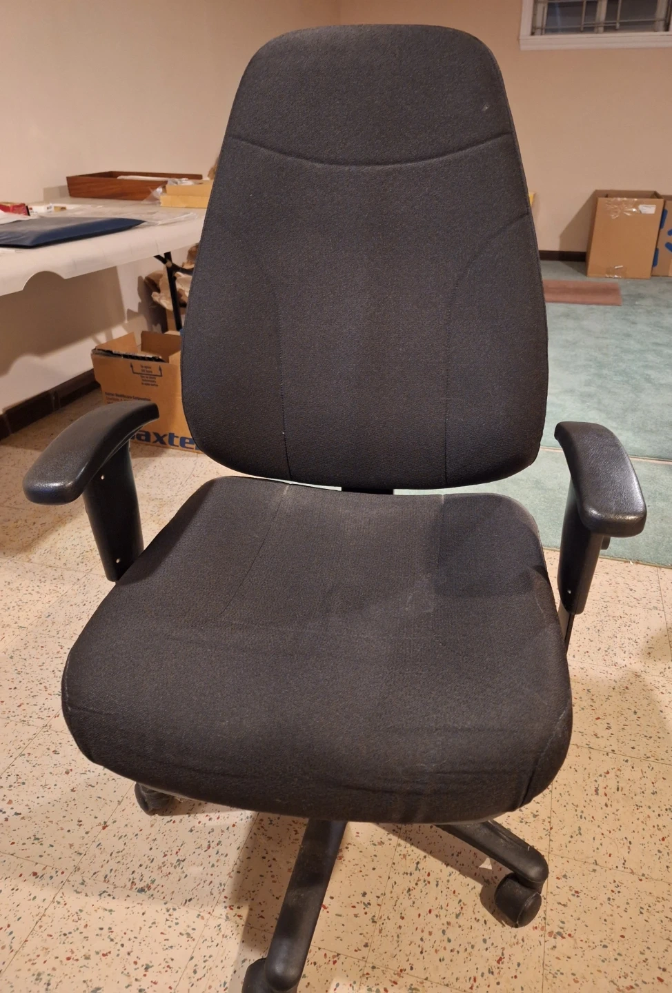 High Back Desk Chair. Adjustable chair seat and arm rest height. Also has a seat and back tilt function. Black fabric. Swivel caster wheels.