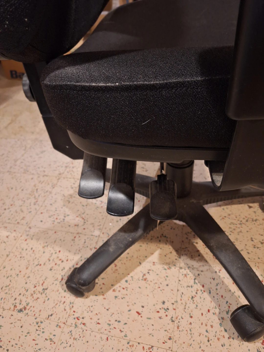 High Back Desk Chair. Adjustable chair seat and arm rest height. Also has a seat and back tilt function. Black fabric. Swivel caster wheels.