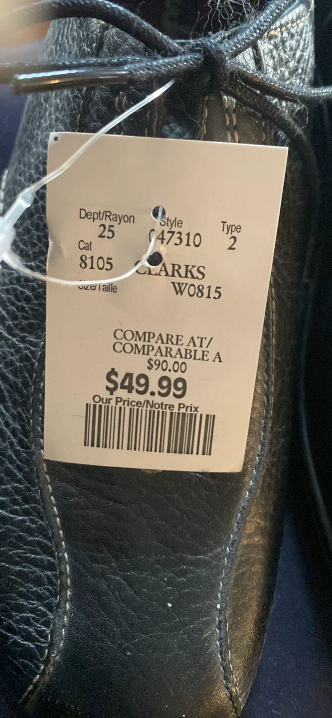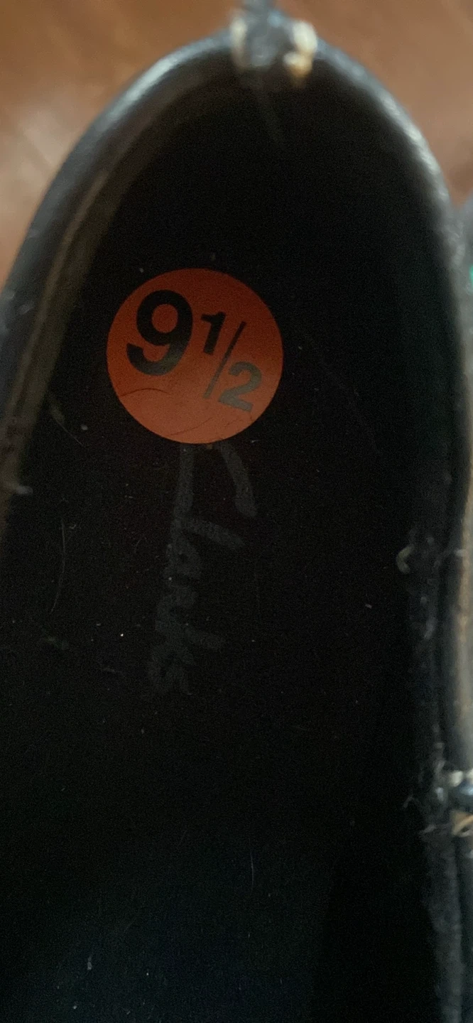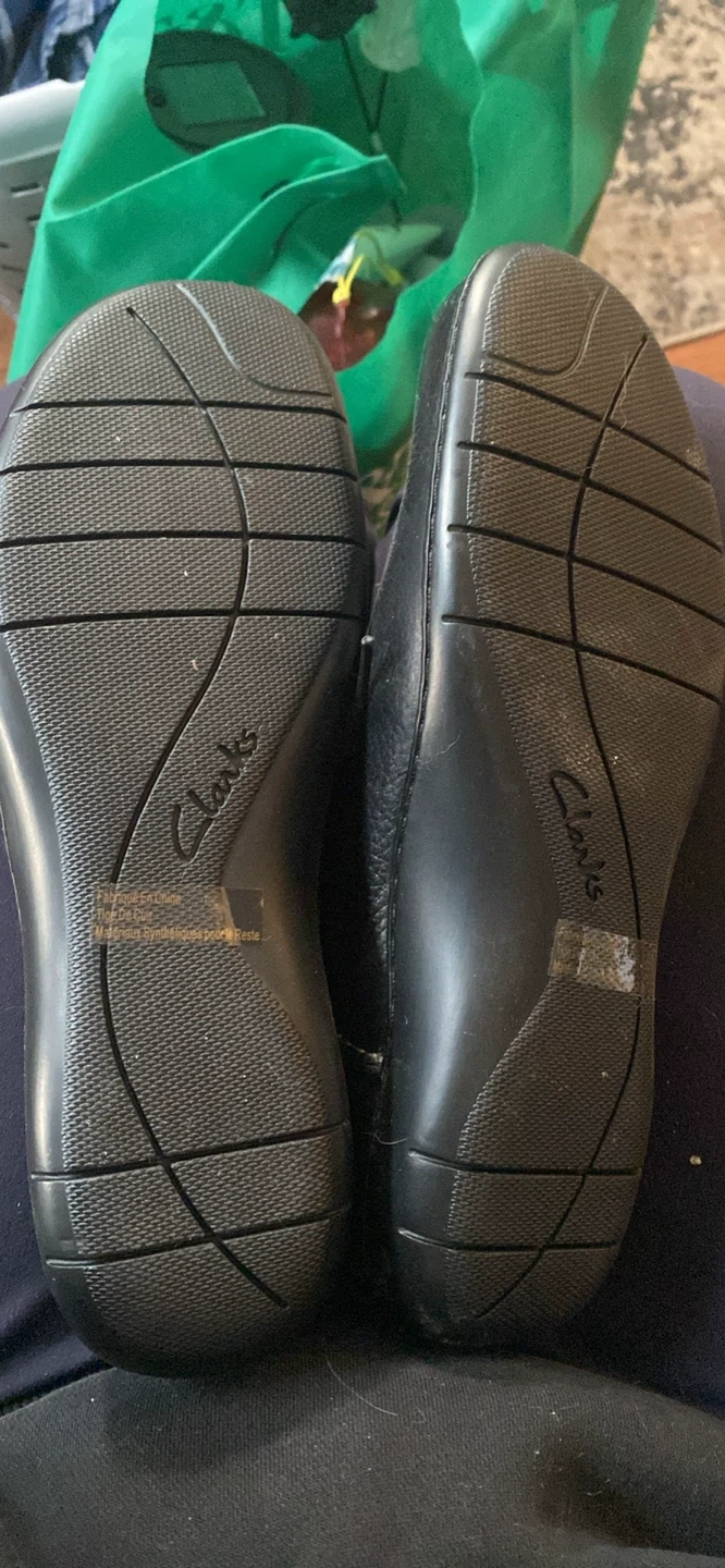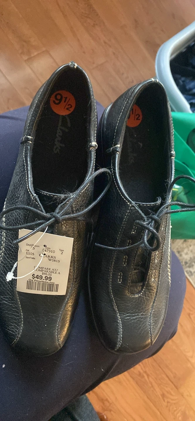 Selling a pair of Clarks black leather shoes in size 9.5. They have a classic and comfortable design, perfect for everyday wear. The original price was $49.99.