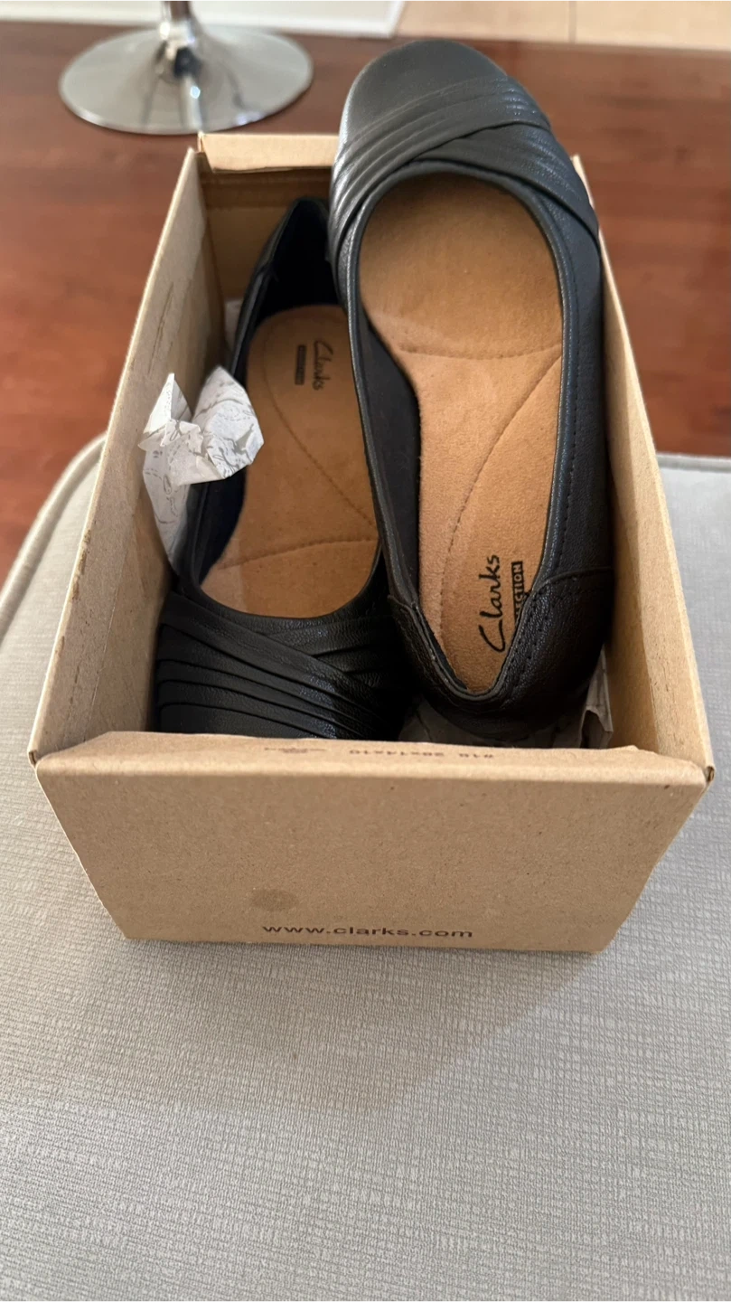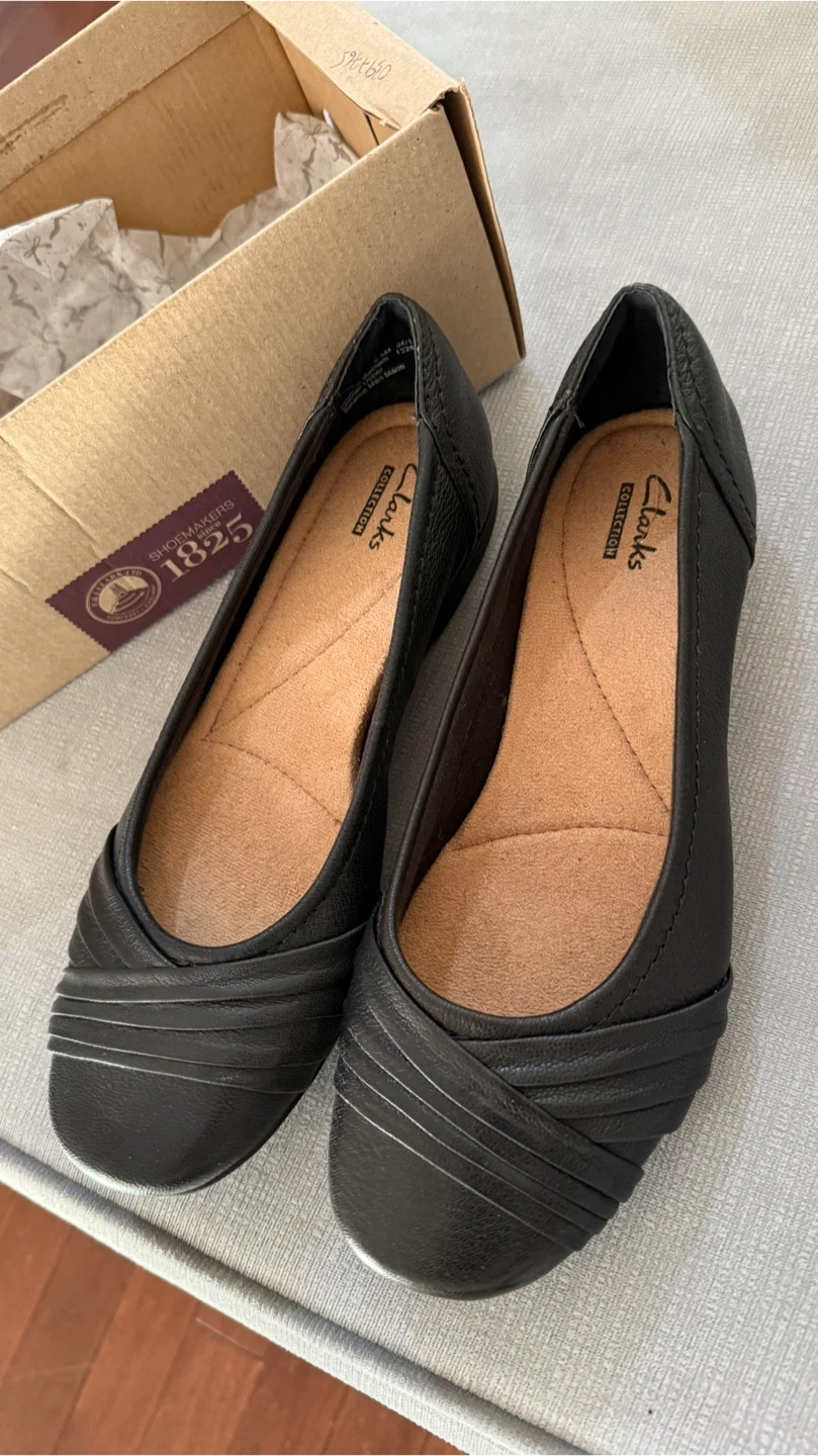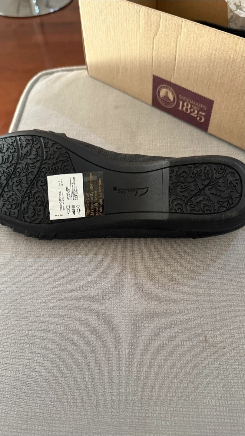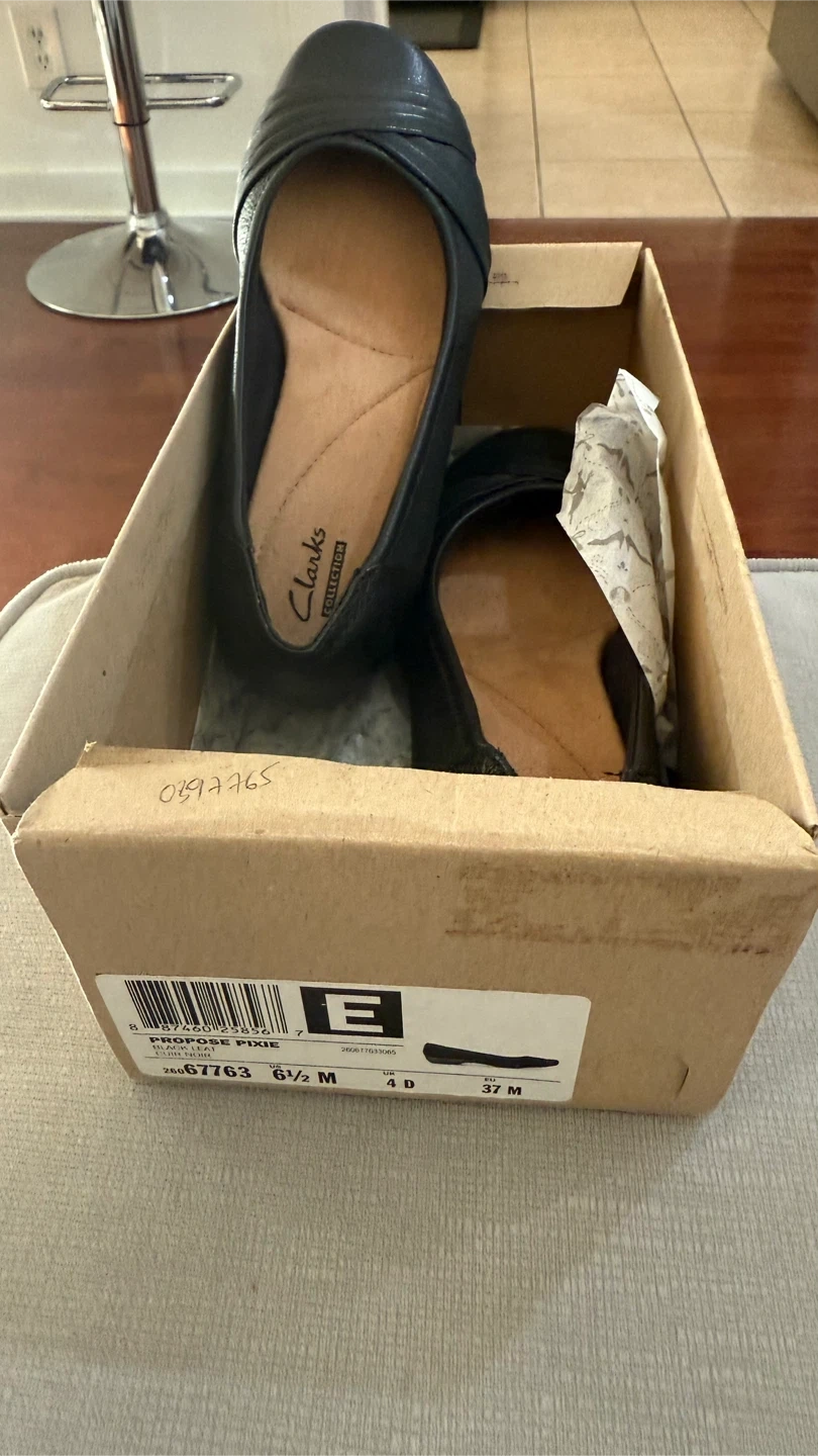 Selling a pair of Clarks Propose Pixie black leather flats in size 6.5. They come with the original box. These are a stylish and comfortable choice for everyday wear!
