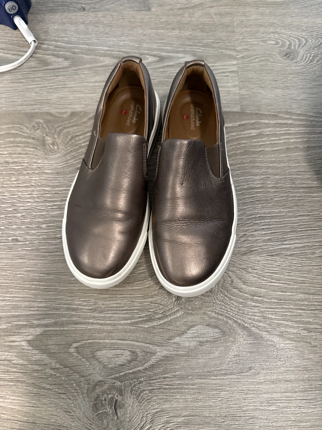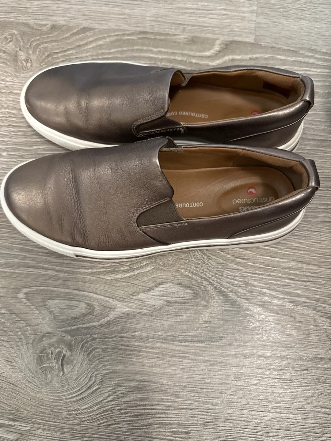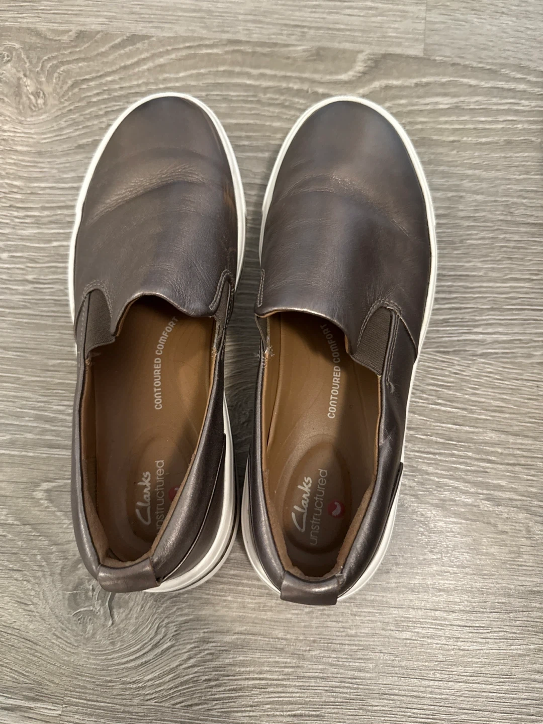 10These are a pair of Clarks Unstructured slip-on shoes. They feature a contoured comfort insole and a stylish, easy-to-wear design. Perfect for everyday wear!