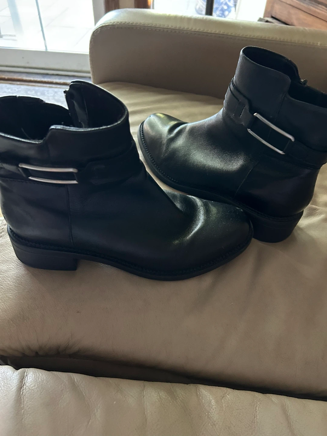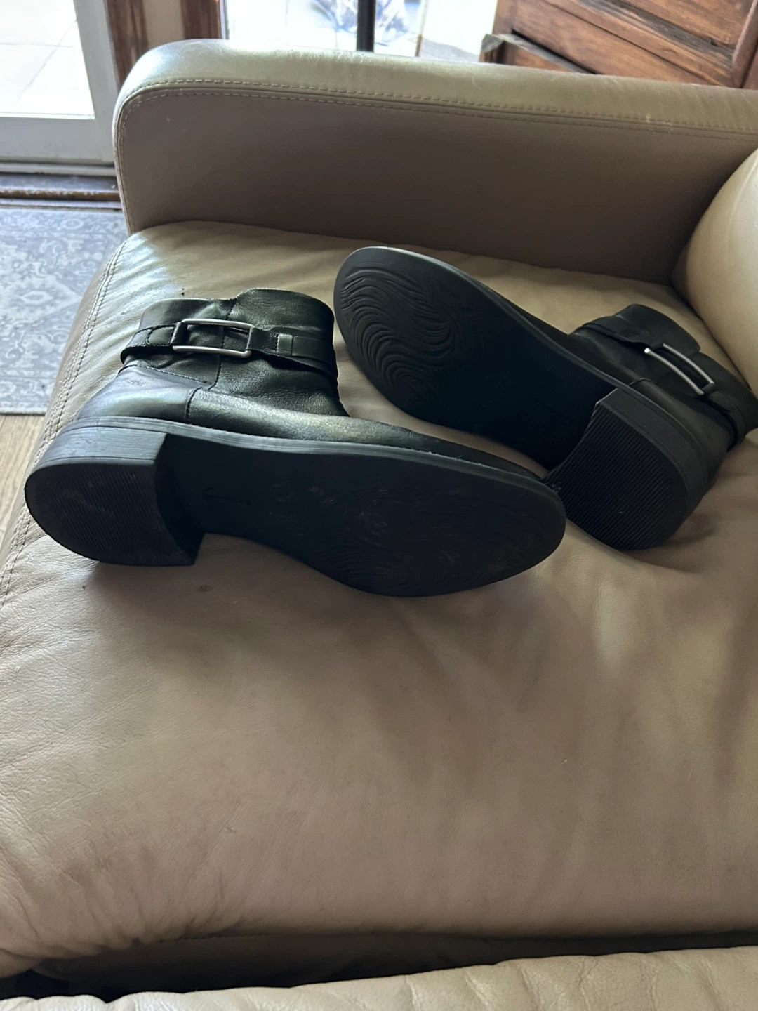 Selling a pair of Clarks women's black leather boots in size 9 1/2 These boots feature a stylish buckle detail and are in good condition. Perfect for adding a touch of elegance to your wardrobe!
