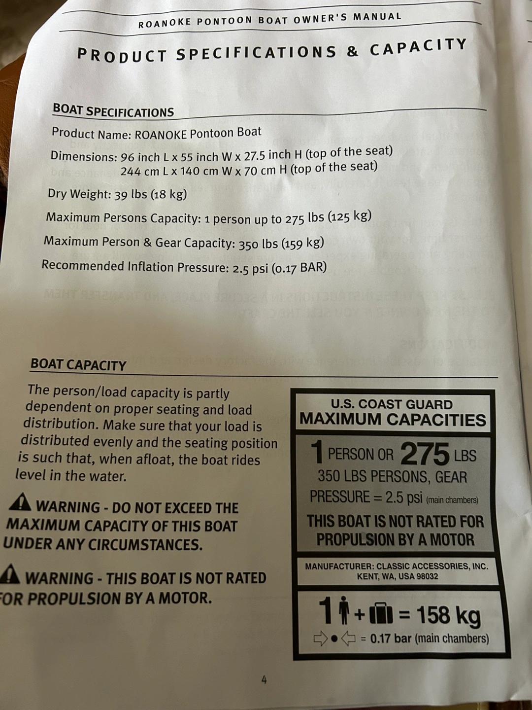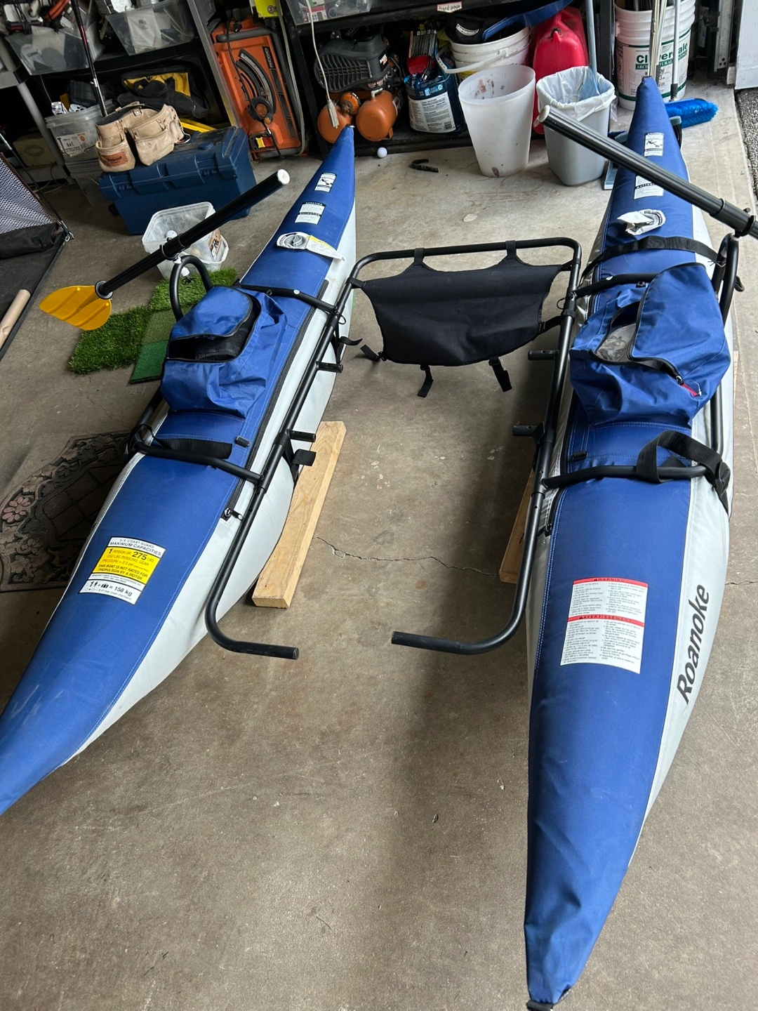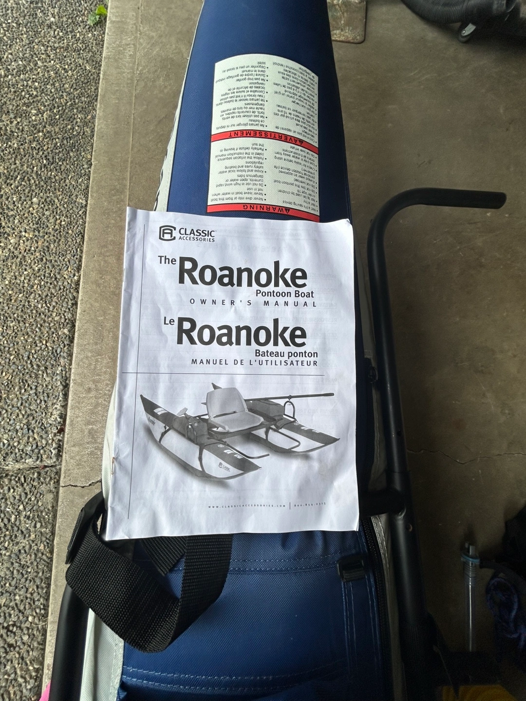 34Selling a Classic Accessories Roanoke pontoon boat. It comes with the oars, pump, and other accessories shown in the pictures. Also includes the owner's manual! The boat is almost new. It does not have a chair and seat frame. You can buy a chair at Home Depot or Canadian Tire.