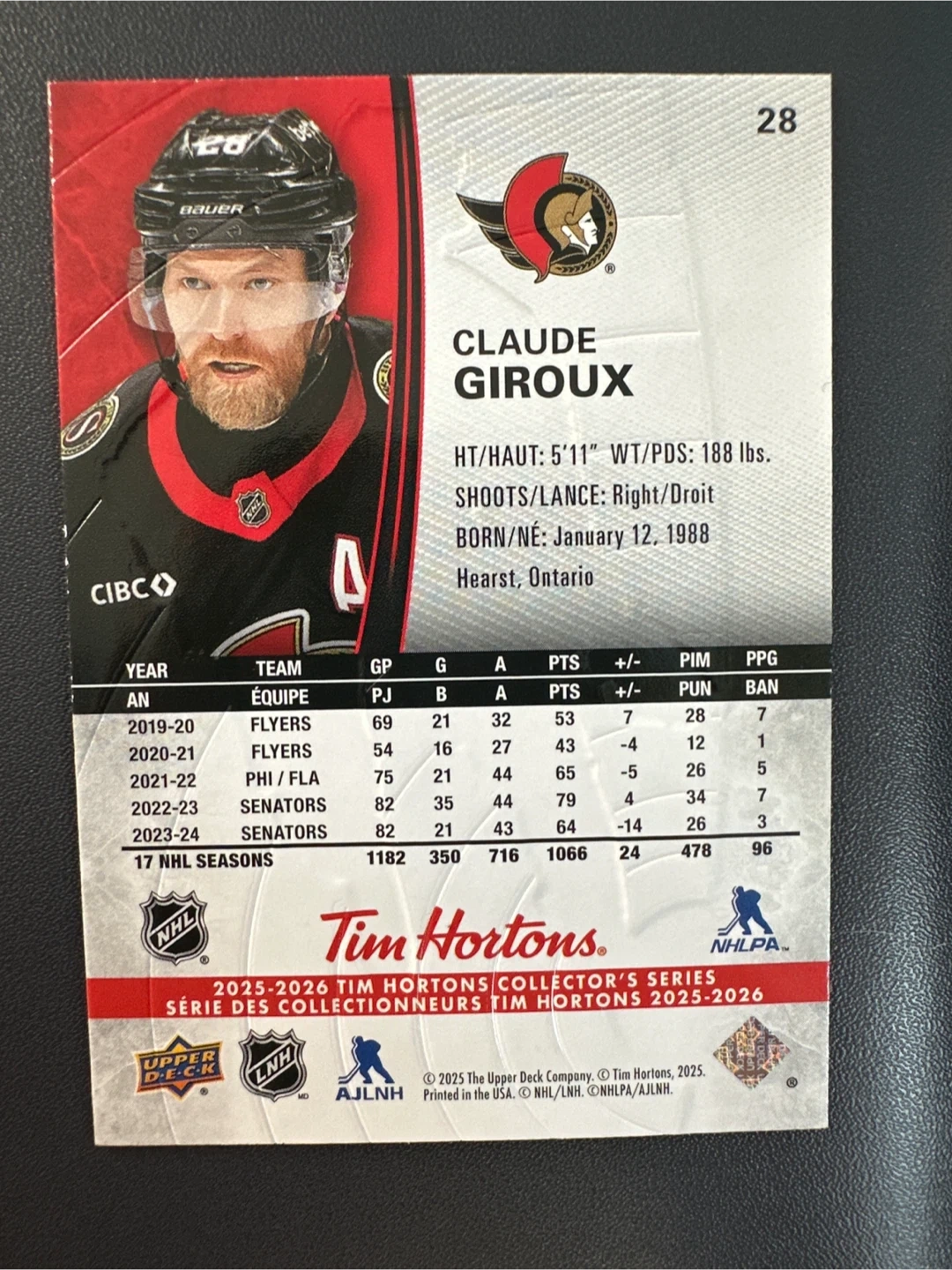 15Selling a Claude Giroux hockey card from the 2025-2026 Tim Hortons Collector's Series! It's in great condition and ready for a new home with a hockey fan or card collector
