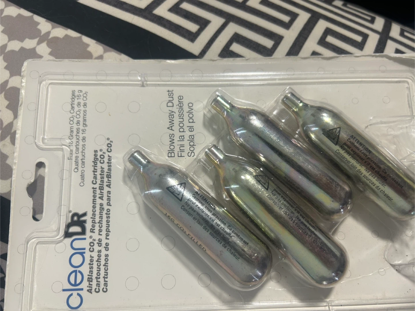 Selling a pack of CleanDR AirBlaster CO₂ Replacement Cartridges. These cartridges are designed for delicate electronics and equipment cleaning. They are ozone-friendly and non-flammable, making them safe for use on computers, photo equipment, and office electronics. Each cartridge contains 16 grams of CO₂.