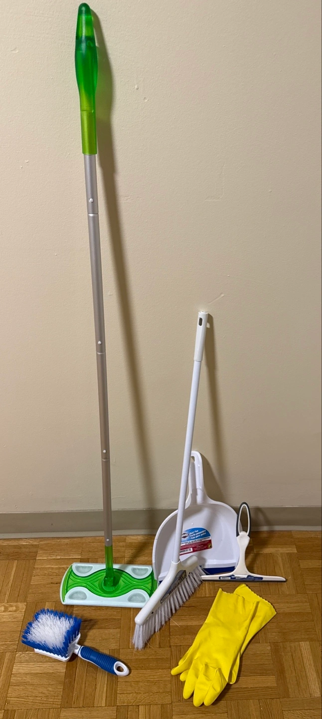 Selling a bundle of cleaning supplies! Includes a mop with a green handle, a white dustpan and brush set, a blue and white scrub brush, a window squeegee, and a pair of yellow rubber gloves. Perfect for getting your place sparkling clean!