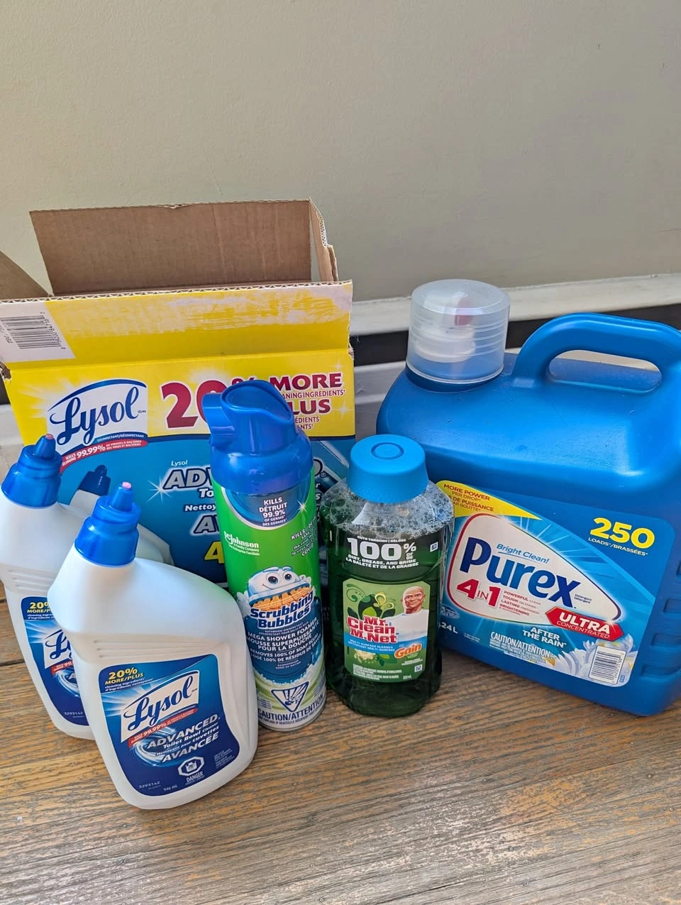 18$5 for each => Lysol Advanced Toilet Bowl Cleaner, 2 × 946 mL $5 for Scrubbing Bubbles Mega Shower Foamer (708g) $3 for Mr. Clean M. Net Multi-Surface Cleaner(828ml) $15 for Purex After The Rain Ultra Concentrated Laundry Detergent (used 1/4) Moving sell. Please checkout my account for other items.