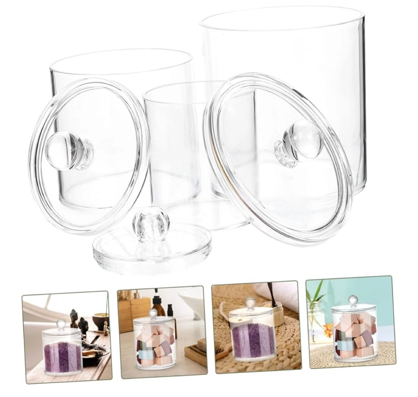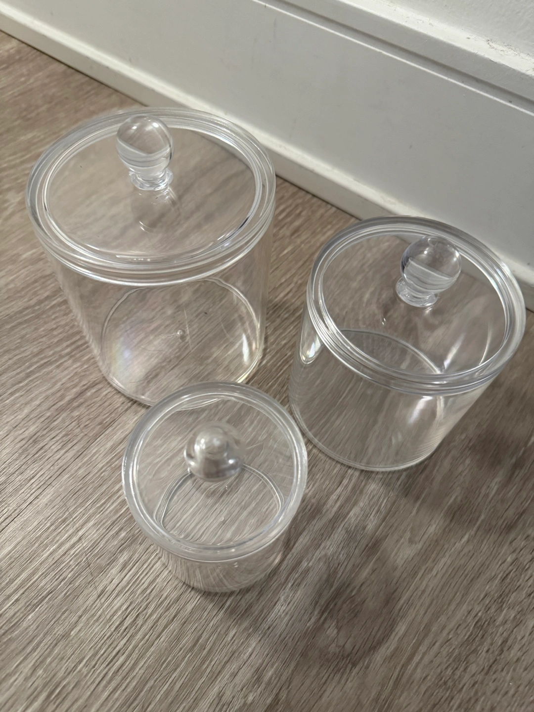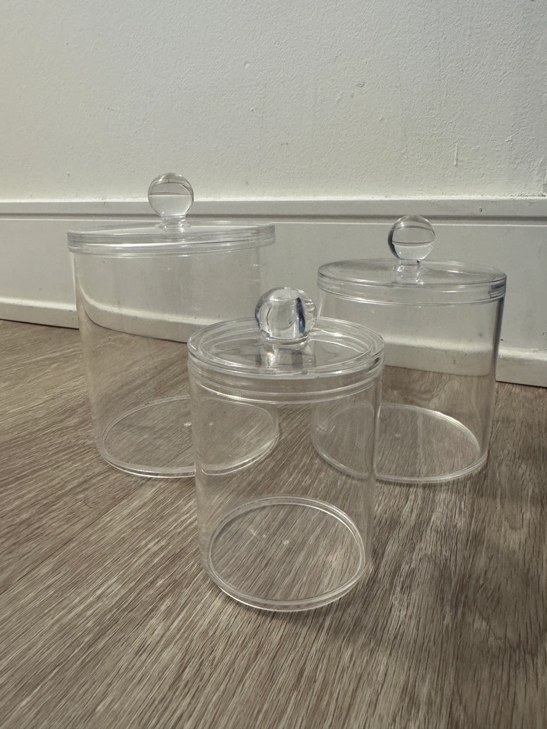 *CASH Only* Brand New Selling a set of three different sizes clear acrylic canisters! They're in great shape and ready to organize your bathroom or vanity. Made with high-grade PS material, they're durable and built to last. The transparent design adds a touch of elegance to any space. [Check Out My Other Listings]