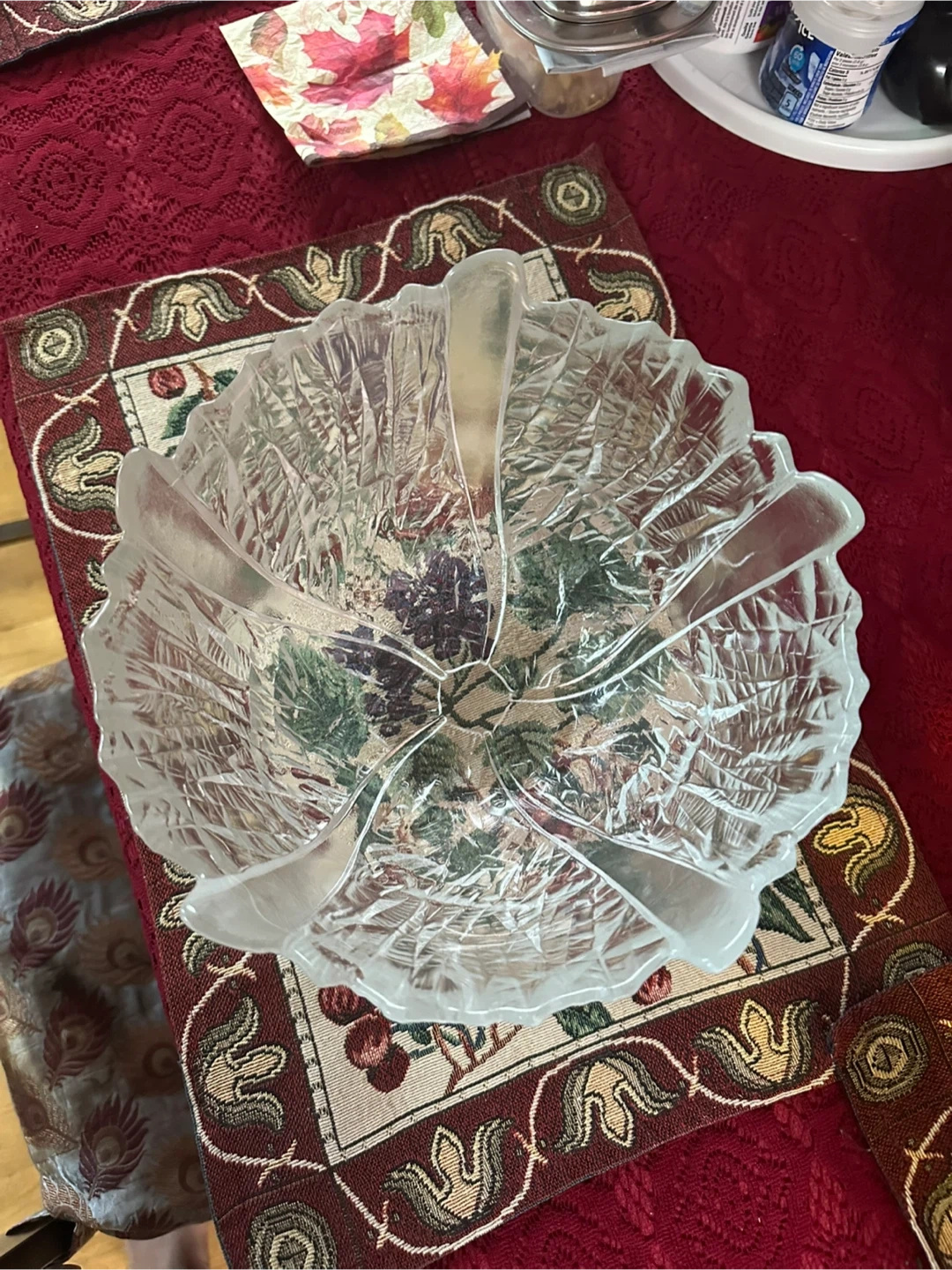 70Selling a lovely clear glass serving bowl. It has a unique design with a textured finish. Perfect for salads, fruit, or desserts for your next gathering!