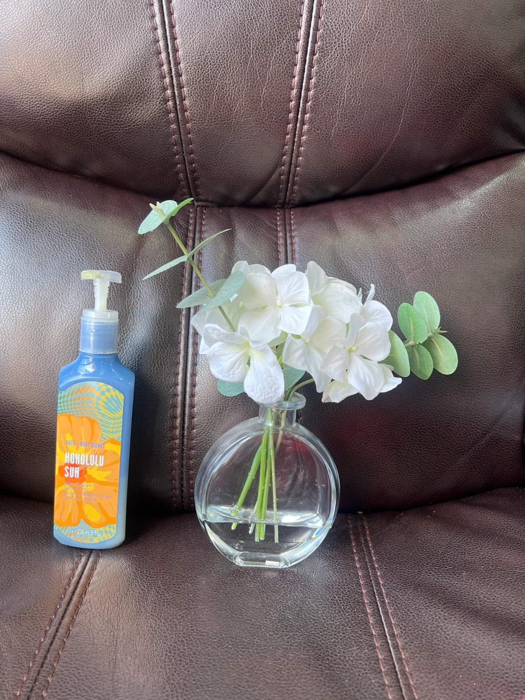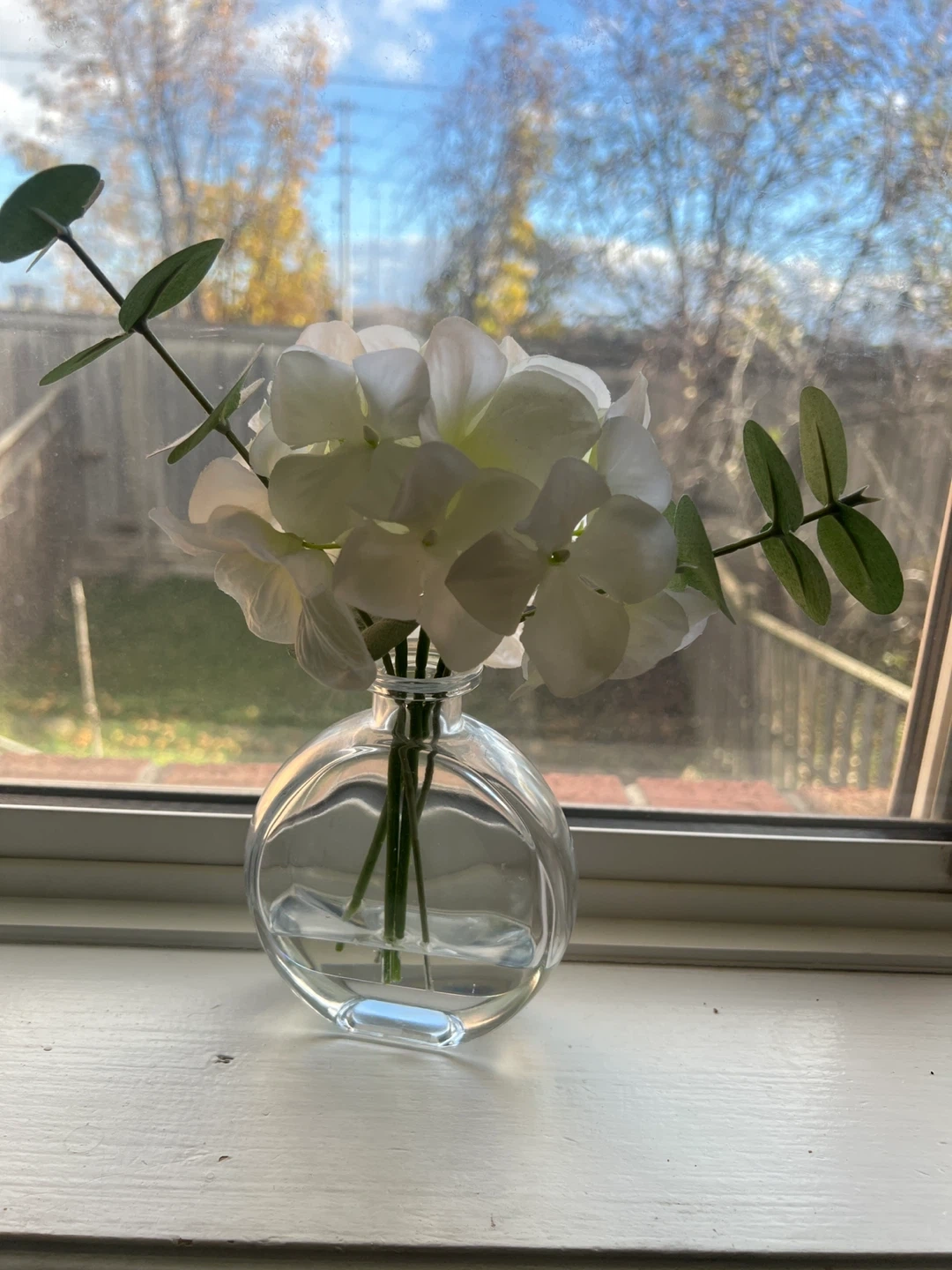 65A lovely clear round vase with artificial white flowers and greenery. It would look great on a windowsill or table!