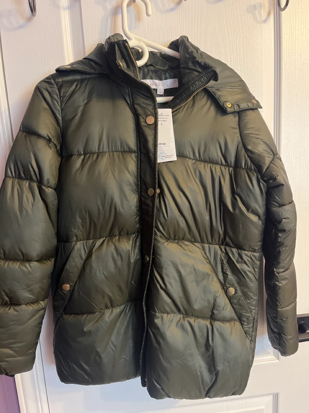 Cozy up in this stylish Cleo puffer jacket! It's a lovely olive green colour and a size large. The jacket is brand new. Hood can be unzipped and taken off. Originally bought for $229.90! Pet and smoke free home. Pick up in Stittsville.