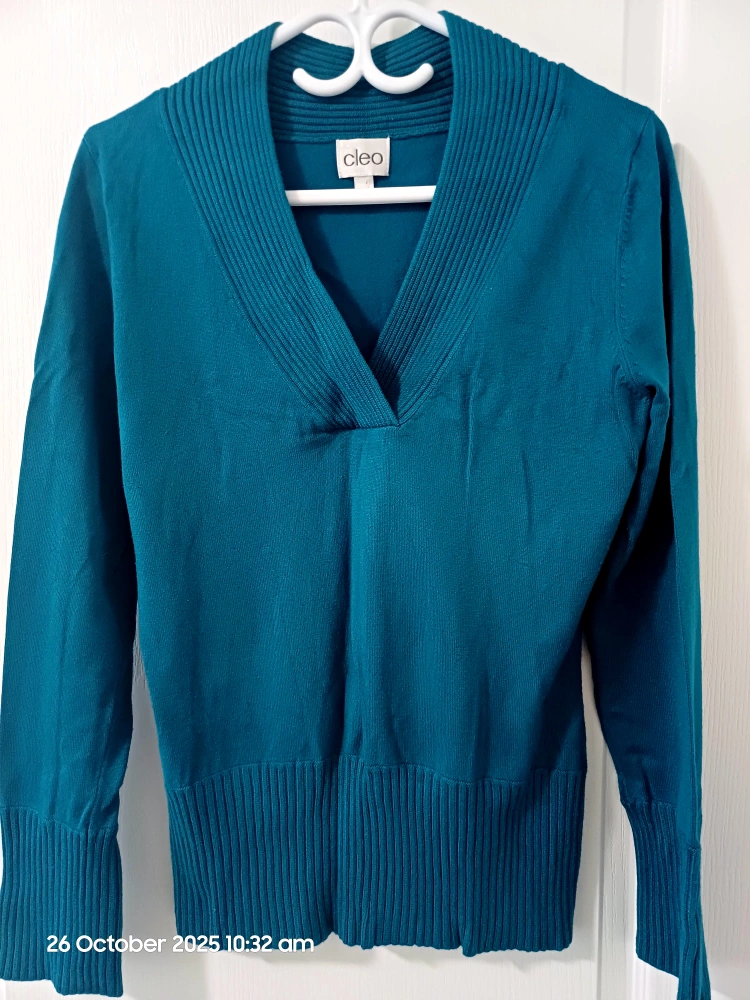 15A lovely teal sweater from Cleo! It features a flattering v-neck design and would be a great addition to your wardrobe for those cooler days