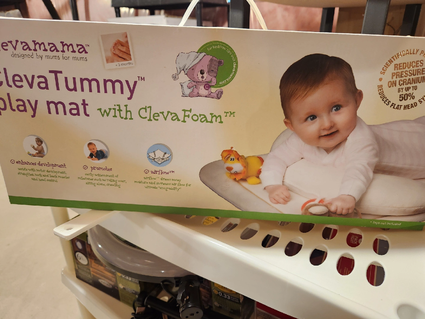 Selling a Clevamama ClevaTummy play mat with ClevaFoam. It enhances development and promotes early achievement of milestones such as rolling over, sitting alone, and crawling. The mat also features airflow, drawing away moisture and increasing airflow for ultimate snug-ability