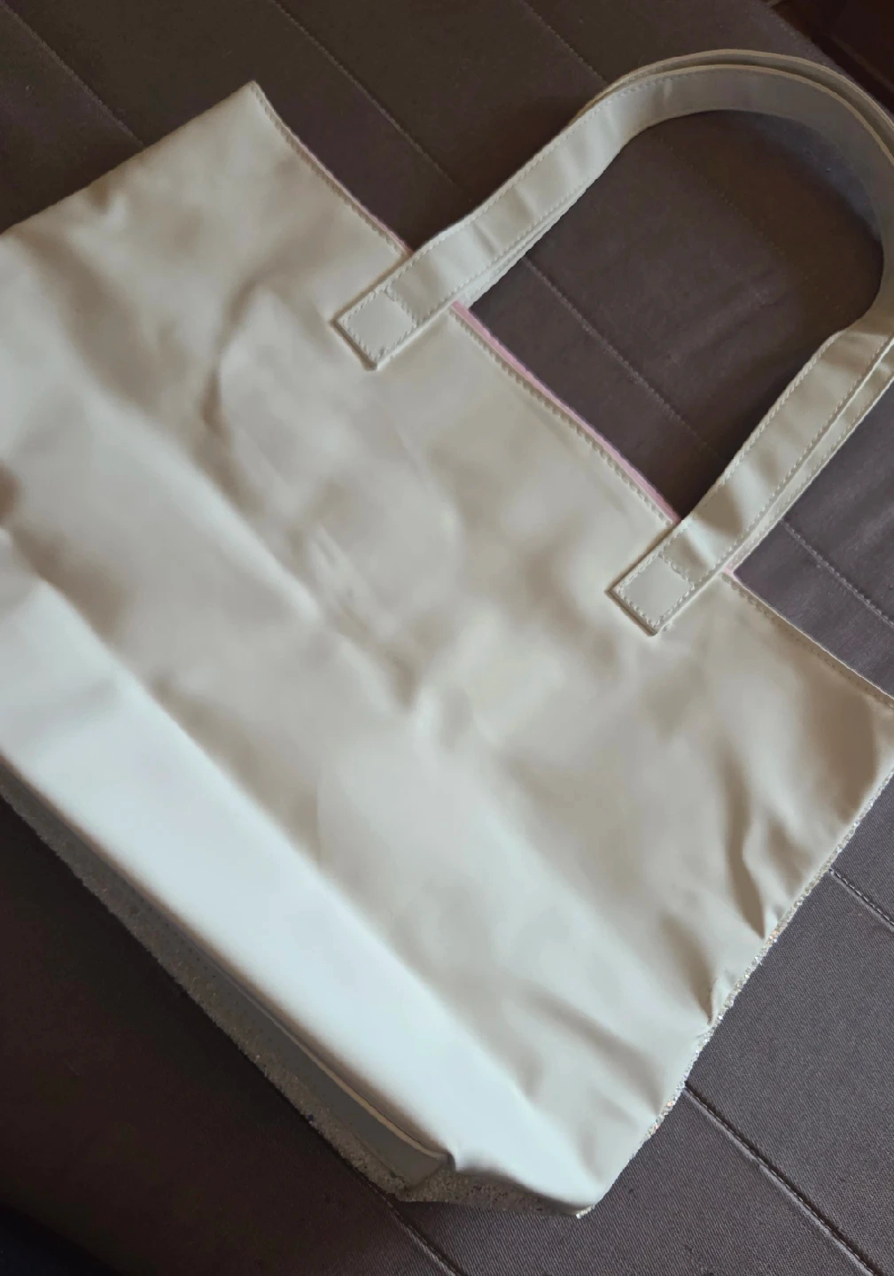 20Brand new Clinique tote bag with tags still attached! The outside is covered in white sequins, and the inside is a pretty pink colour. Perfect for carrying your essentials in style