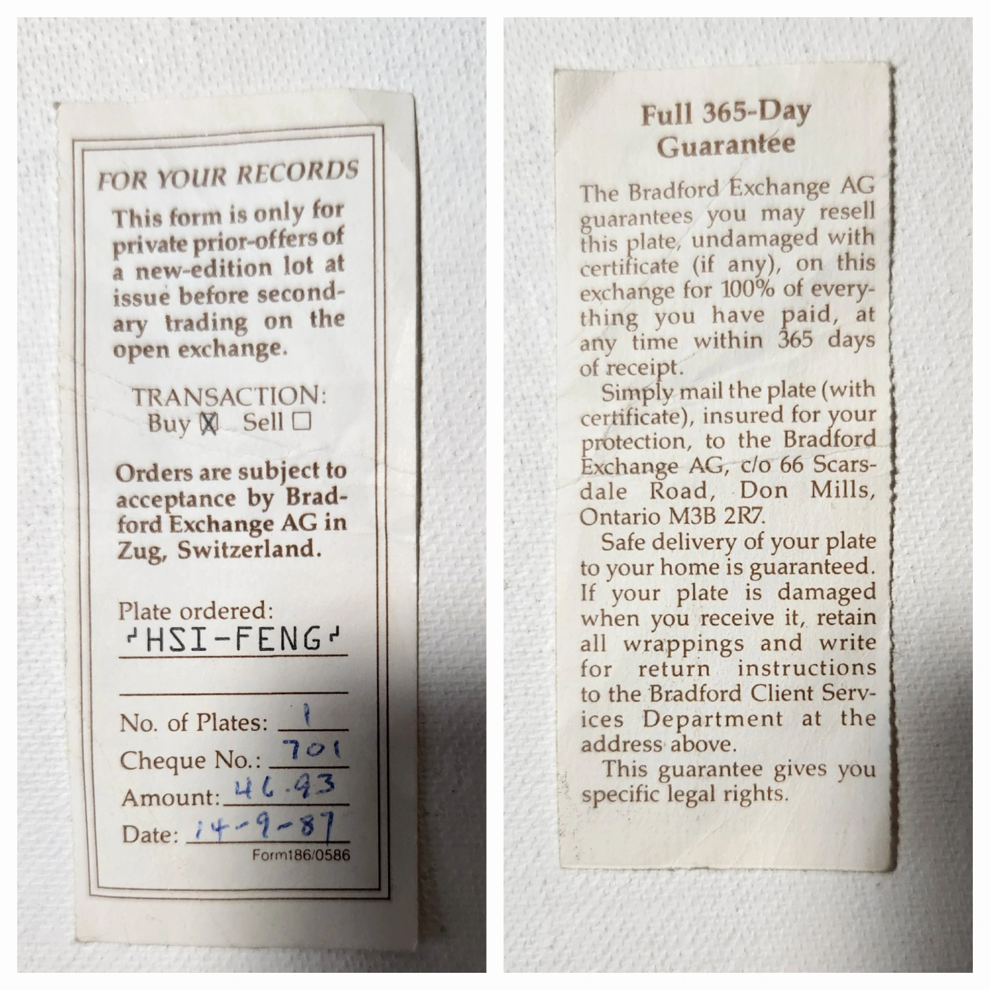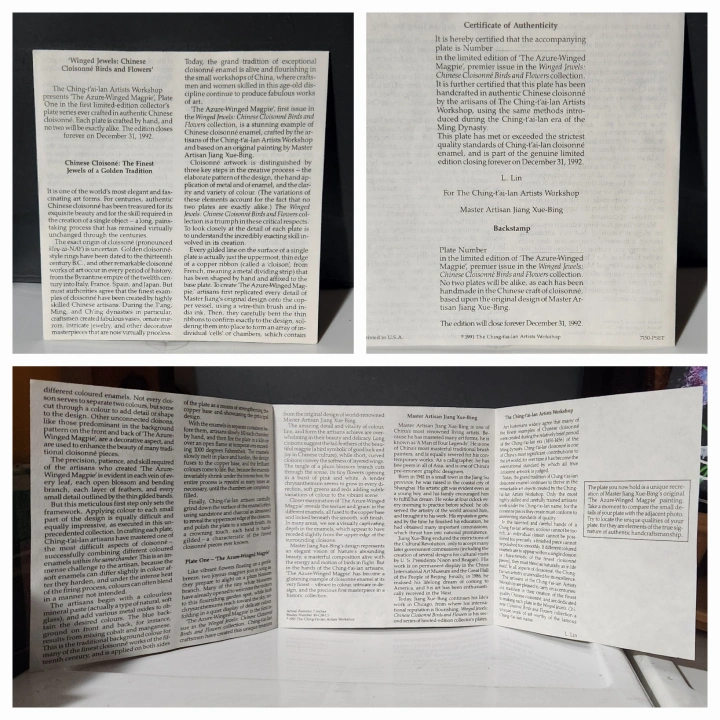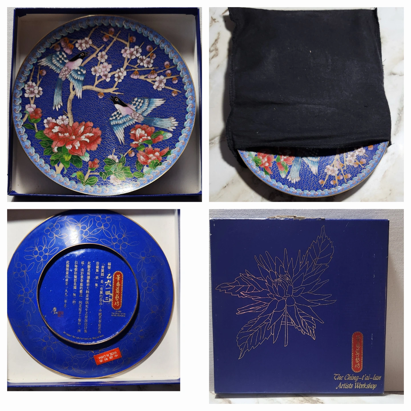 20Single plate. Vintage cloisonné collector's plate from the Ching-T'ai-Lan Artists Workshop. Titled "Winged Jewels: Cloisonné Birds & Flowers" Limited-edition collector's item. Handmade piece of Chinese cloisonné enamel work. Based on an original painting by Master Artisan Jiang Xue-Bing. Includes papers, box & protective sleeve. Pick up only.