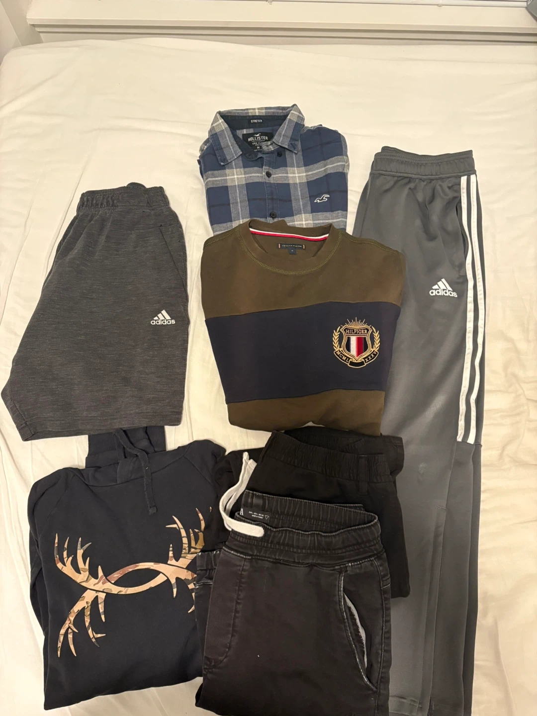 18brands include adidas, hollister, tommy hilfiger, zara! there’s hoodies, button ups, workout tops, shorts, and shirts all for 60 if u want one in particular message me sizes are mostly medium, some large