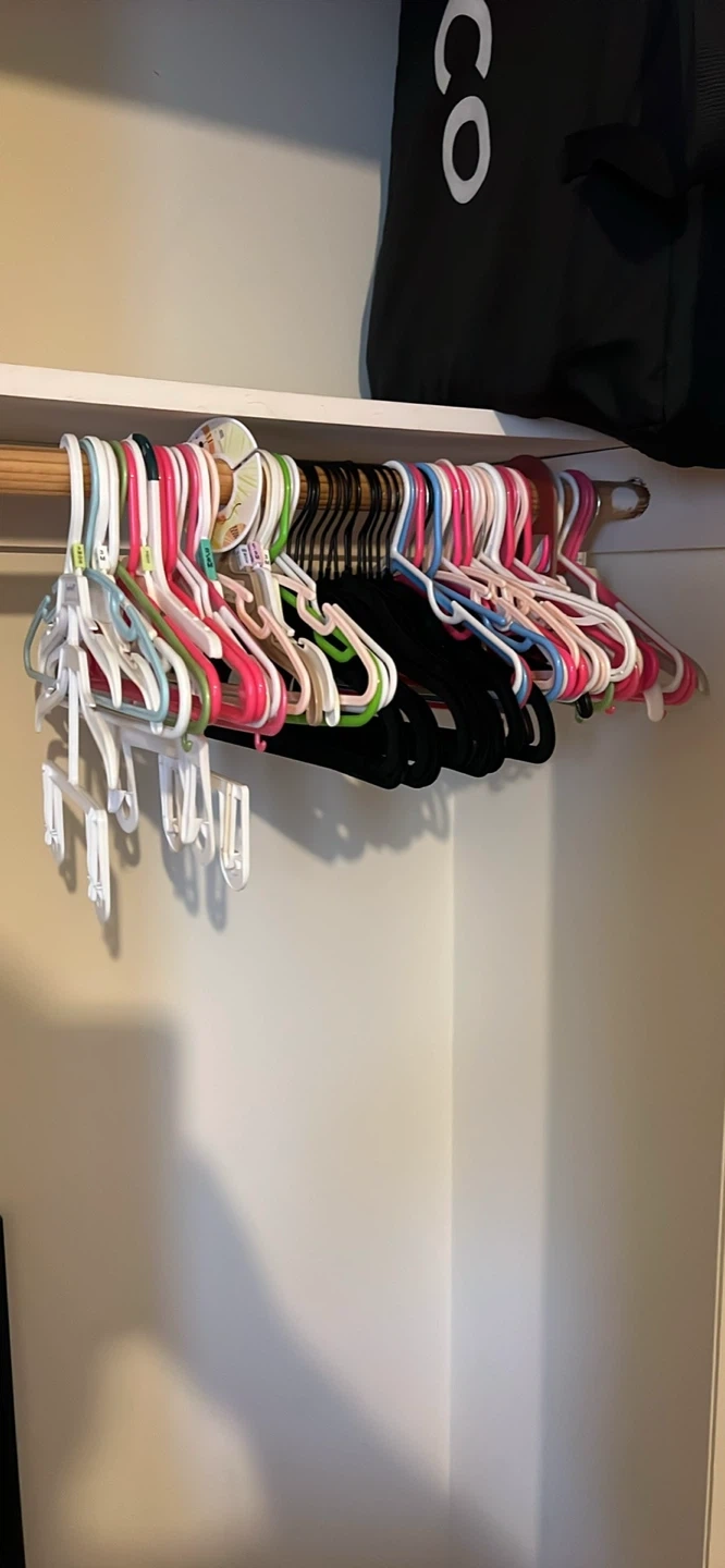 Selling a variety of clothes hangers! There's a mix of plastic and velvet hangers in different colours like pink, white, green, and black. Perfect for organizing your closet. About 100 hangers