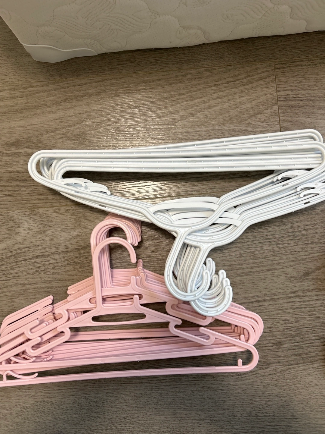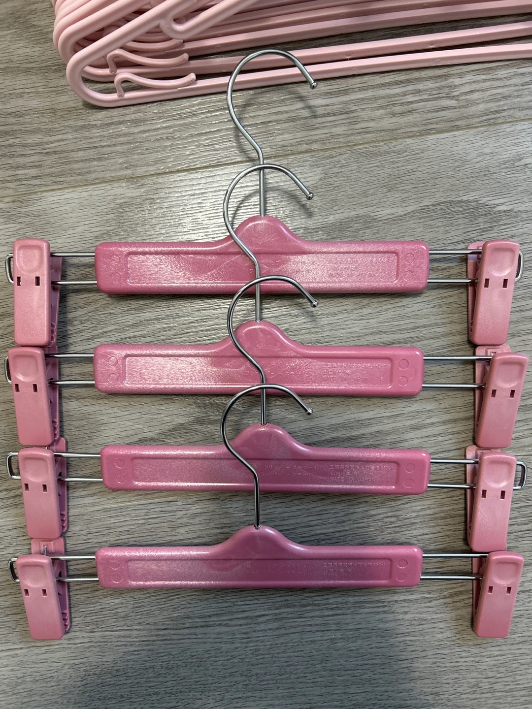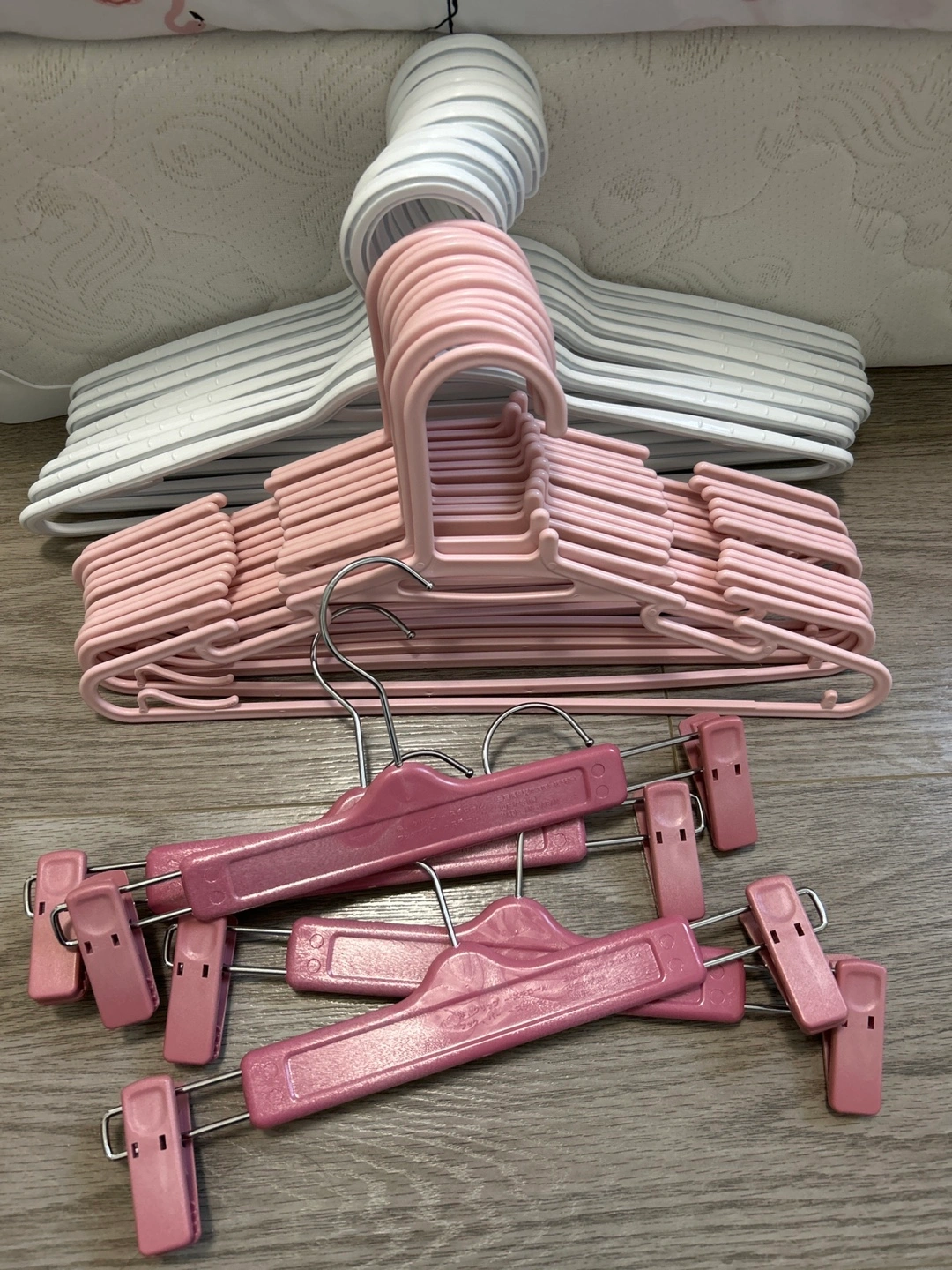 Decluttering my closet and have a bunch of clothes hangers to pass along! There are 12 pink and 11 white ones, including 4 with clips. Ready for a new home!