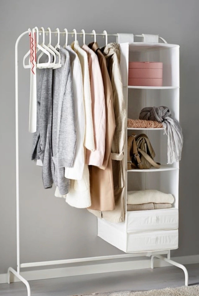 73Declutter your space with this simple yet functional clothes rack, perfect for adding extra hanging space in any room! This rack is used, but still in great shape, ready to handle your wardrobe needs. It features a clean design and sturdy construction. Additional specs: - Dimensions: 99 cm x 152 cm - Colour: White
