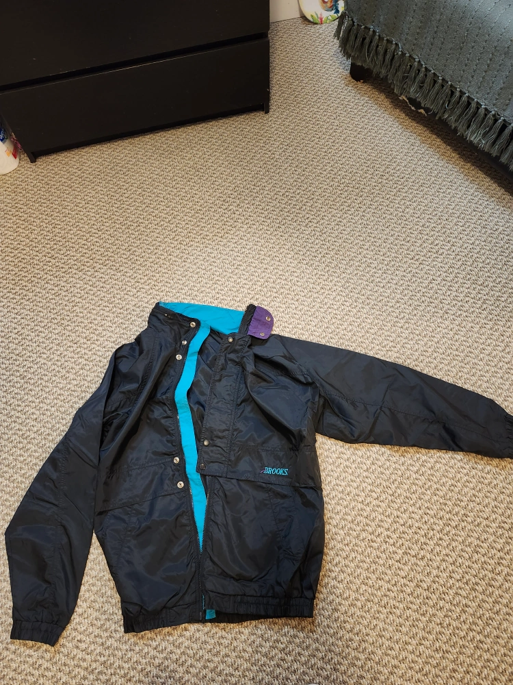 138Black with turquoise trim, nylon jacket with hood jipped inside the collar. Bomber style, front has zipper and snaps. Nice spring or summer jacket. Cash only and pick up please.