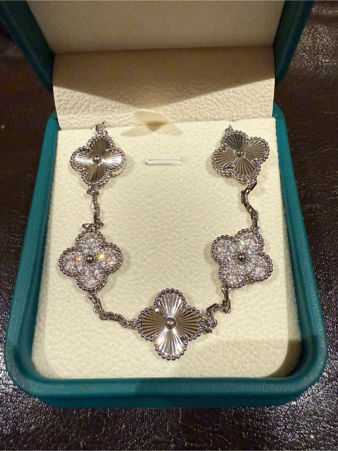 Selling a beautiful fashion bracelet. It's in a brand new condition. The bracelet features the iconic clover design with alternating diamond and guilloche motifs. A beautiful piece of jewelry!