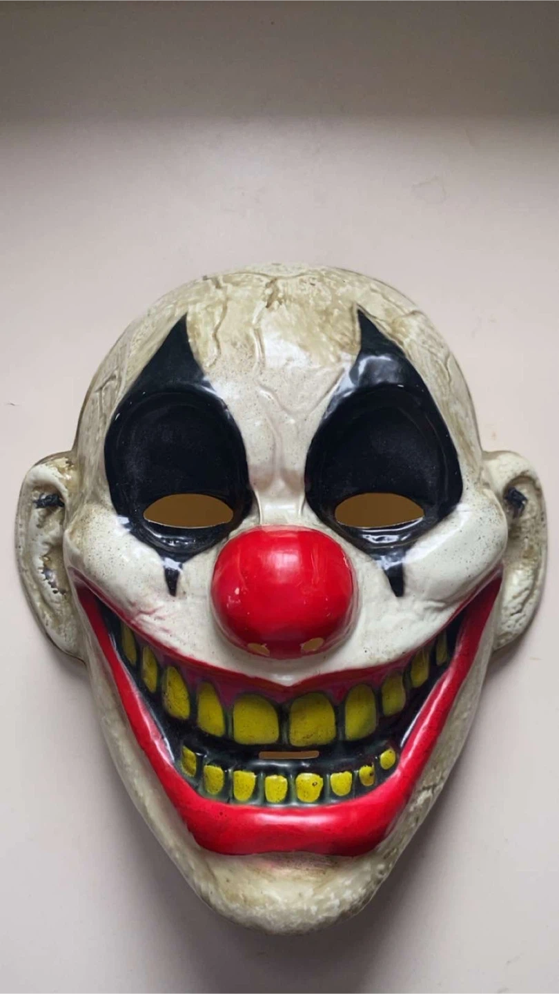 Creepy clown mask, perfect for Halloween or a costume party! It has a red nose and yellow teeth. Small rip on the side but unnoticeable 5$ flat price You’ll be still guhd!