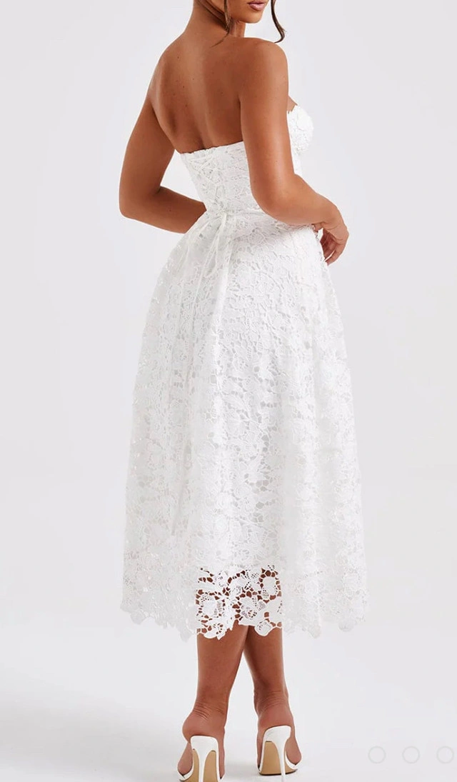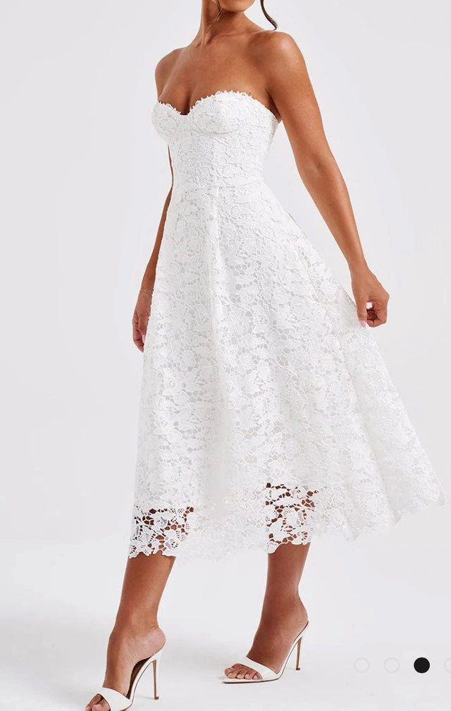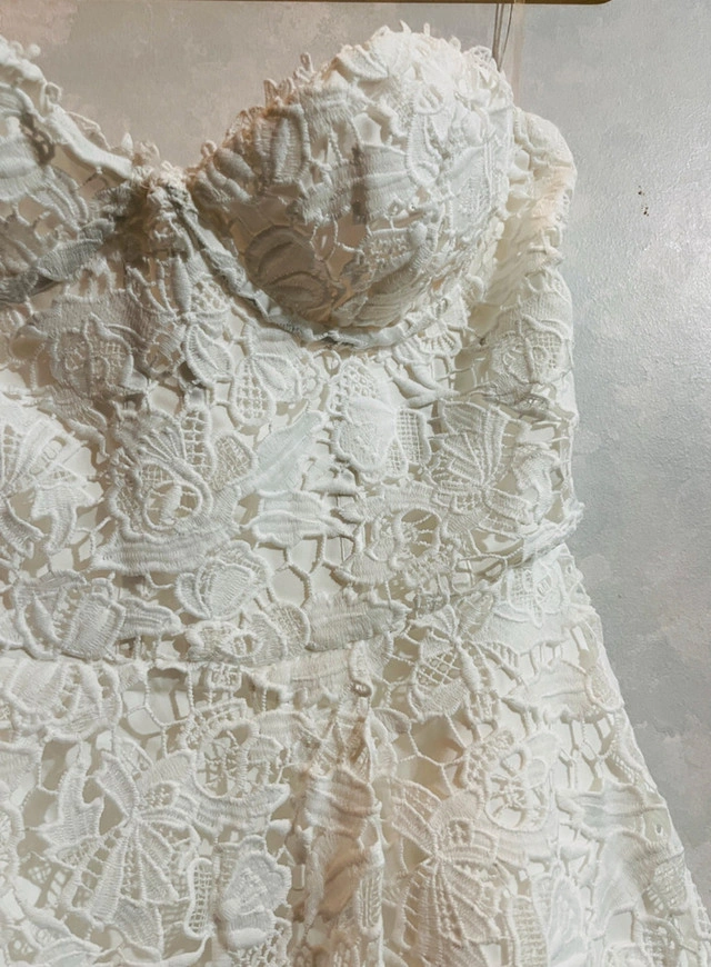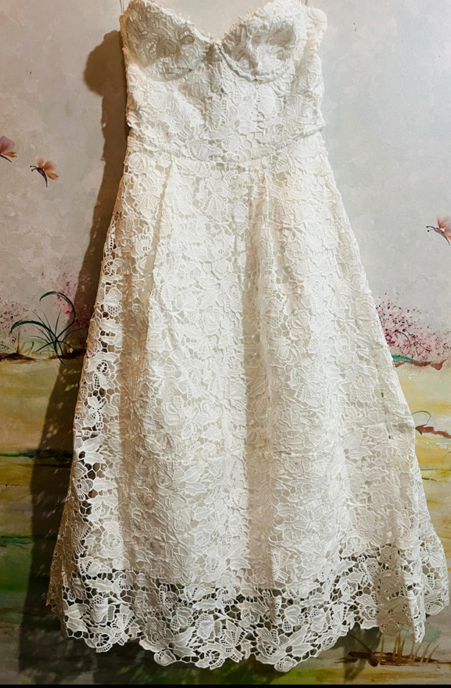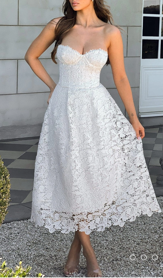 86Fall in love with this brand new delicate lace in the Ishani dress, an elegant midi with strapless corset bodice which has boning and lace up back for a super cinched waist. The all-over lace design is fully lined and has tulle in the skirt for extra volume. Wear her with soft waves, glowy makeup and clear mule heels. Colour: Ivory. Premium floral lace fabric. Fully lined. Underwired bust. Boning in bodice. Tulle in skirt for volume. Lace up back for cinched waist. Invisible zipper to side. Midi length. Also available in size large. Don't miss out on this beautiful dress! If you're reading this, yes, it's still available! Available for pick up in Brampton near Sheridan College at Blue Bonnet Drive