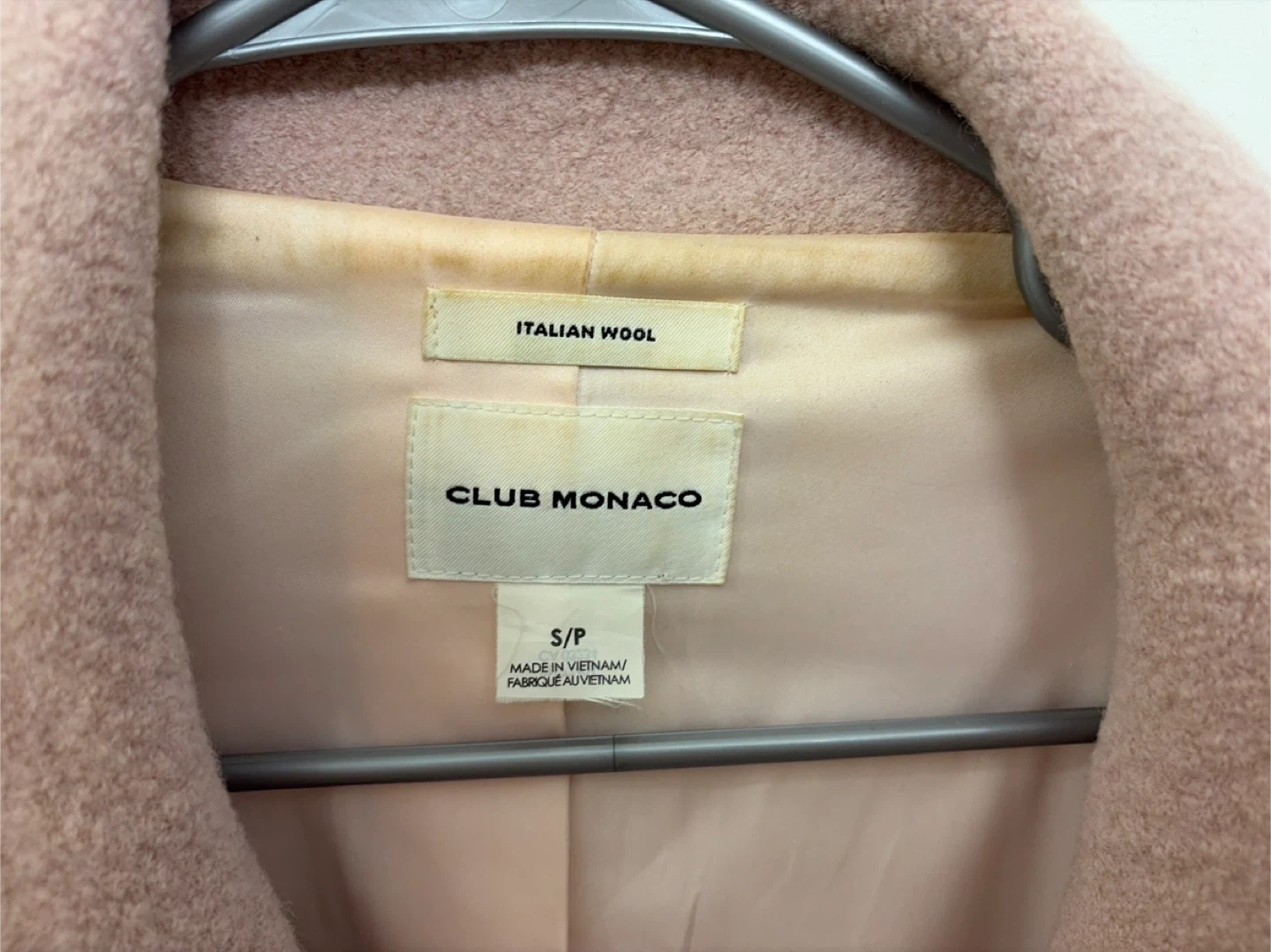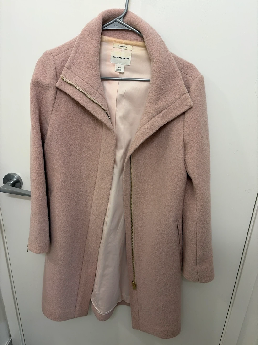 171Selling a Club Monaco coat made with Italian wool. It's a lovely light pink colour and is a size small. The shell is 100% wool.