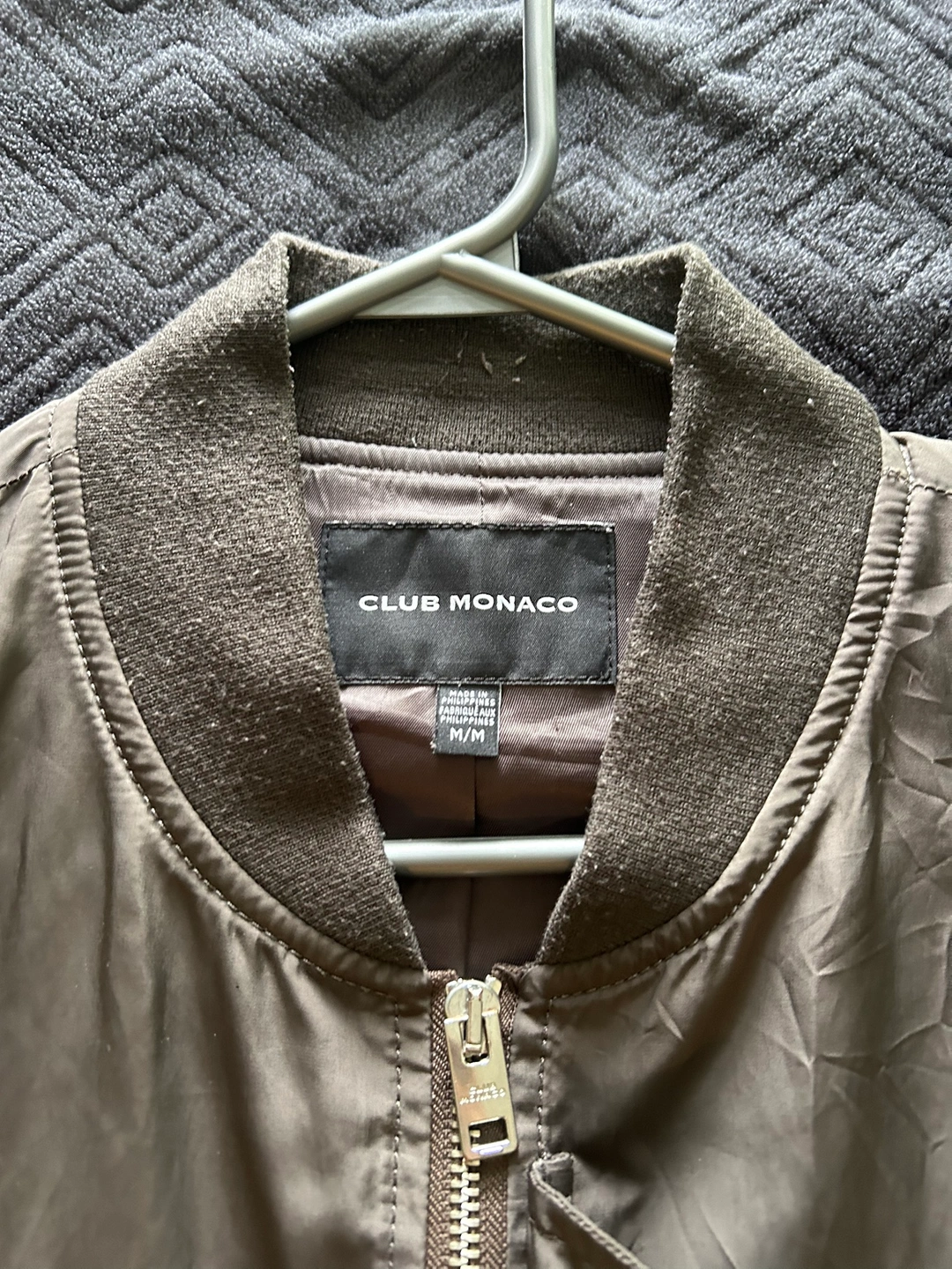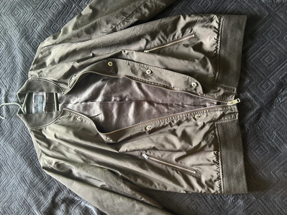 Men's size Medium, olive green colour. Features a zipper closure with an additional button closure. There are zippered pockets on the sides. The jacket has a ribbed collar, cuffs, and hem. Made in the Philippines.