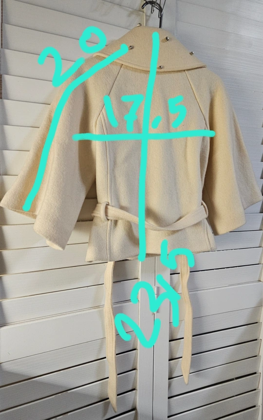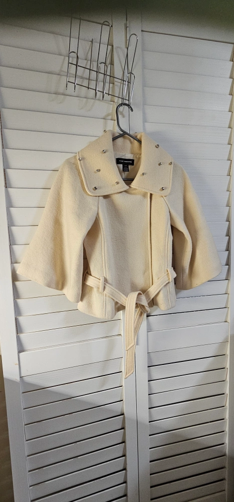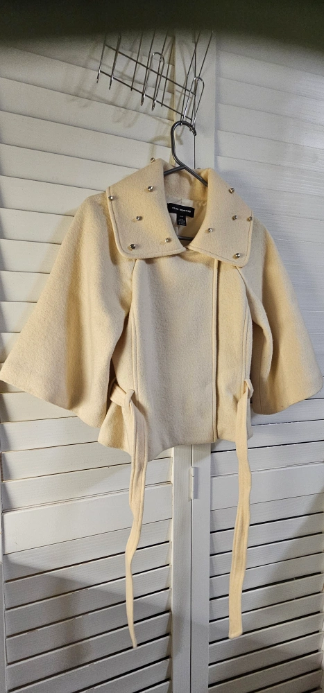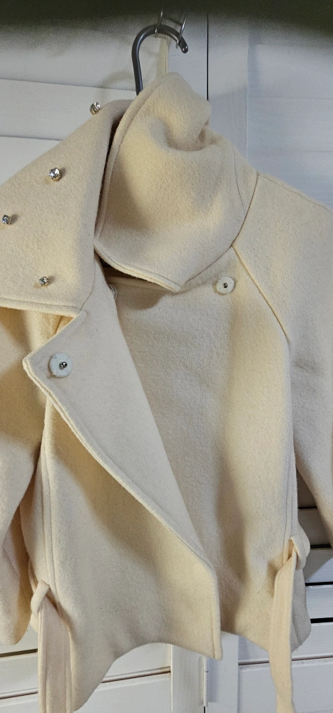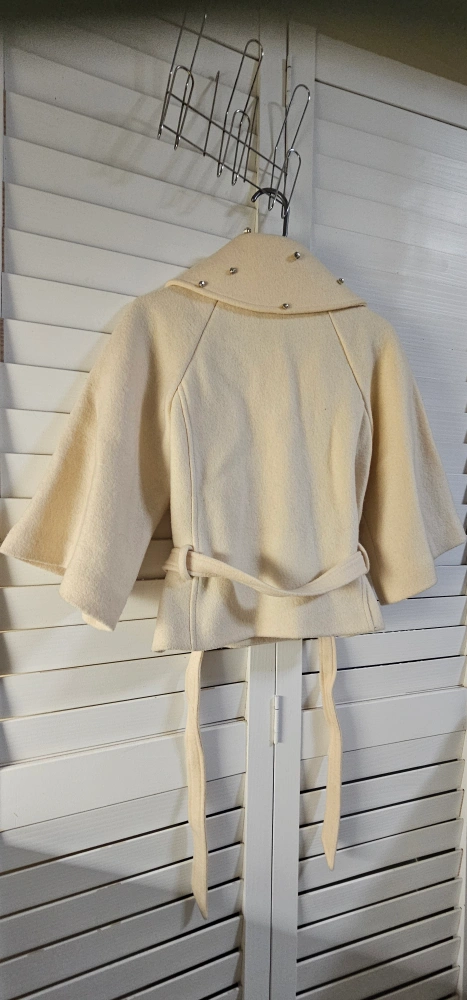 Cream-coloured short jacket. Features a notched collar, short sleeves, and a self-tie belt. Embellished with small studs at the collar. Size XS/TP.