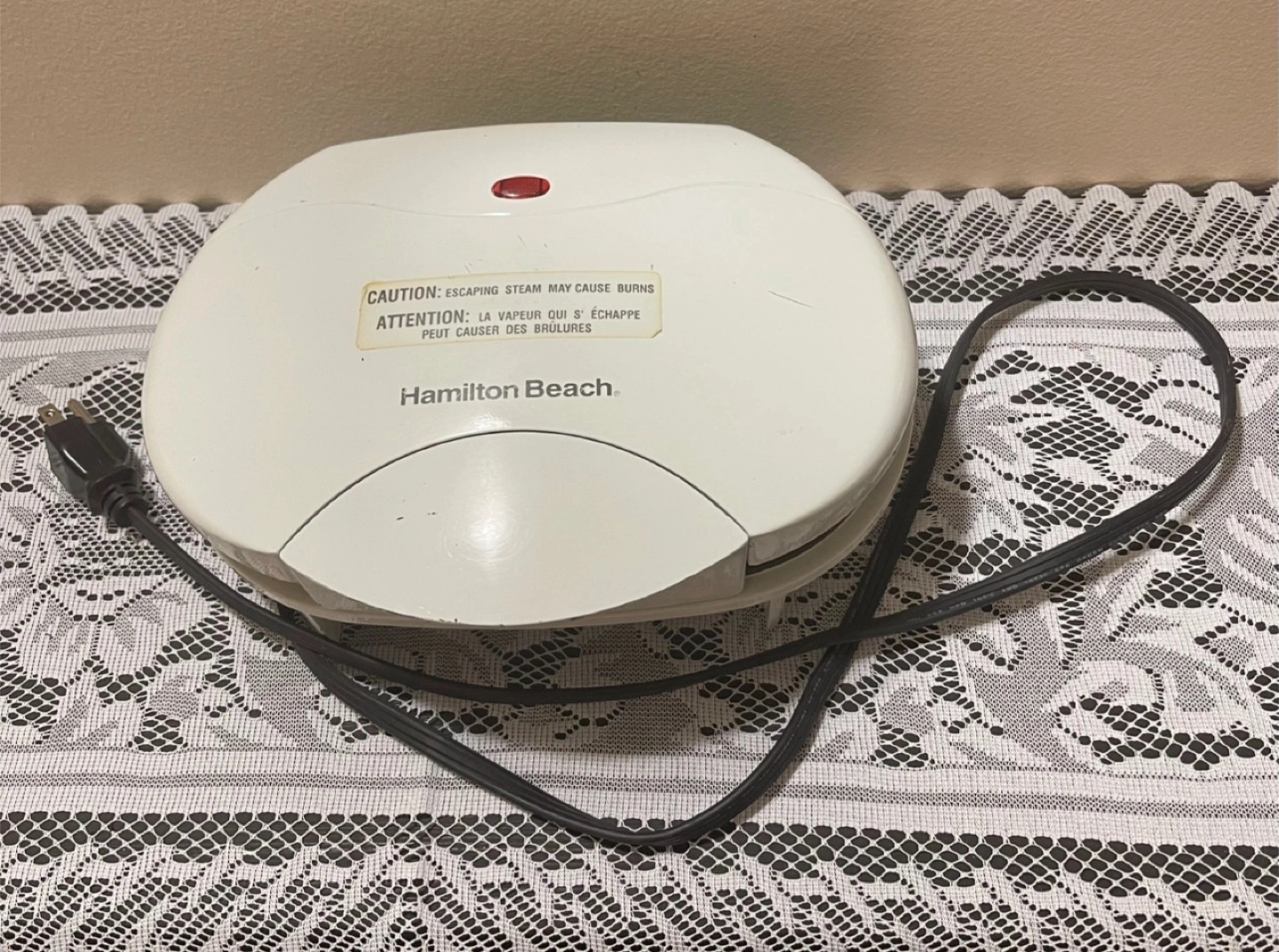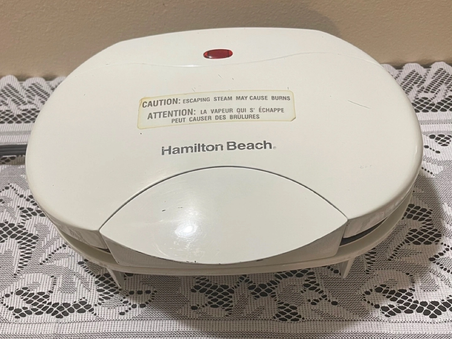 Compact electric panini press. Sandwich maker press, grilled cheese maker. White plastic casing. Non-stick cooking plates. Perfect for double cheese toastie, grilled cheese sandwiches, egg sandwiches, and more. Very good condition. Works great.