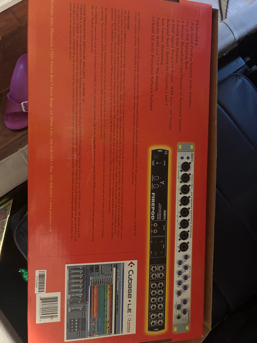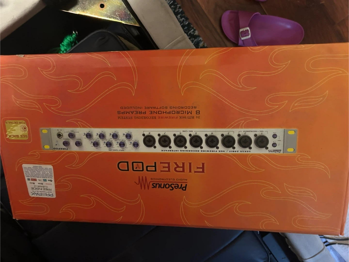This is the PreSonus FirePod audio interface. It offers 8 microphone preamps and 2 instrument inputs. It's a 24-bit 96K FireWire recording interface with zero latency monitoring. Recording software is included!