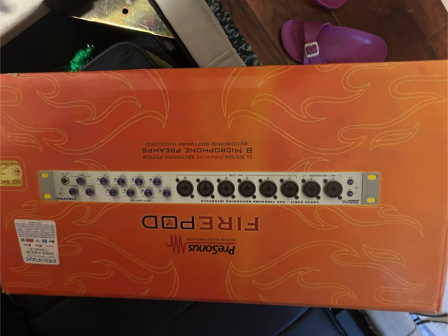This is the PreSonus FirePod audio interface. It offers 8 microphone preamps and 2 instrument inputs. It's a 24-bit 96K FireWire recording interface with zero latency monitoring. Recording software is included!