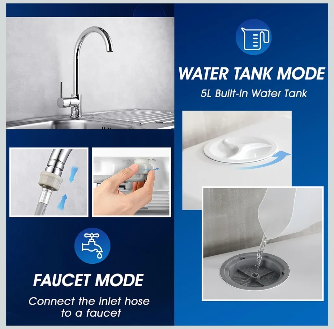 This compact countertop dishwasher offers 5+1 washing programs, including Normal, Speed, Glass, Baby Care, and Fruit. It's designed for families of 3-4, with a capacity for 4 dinner plates, 4 small plates, 4 serving bowls, 4 cups, 1 glass, 7 spoons, 7 forks, and 7 knives. It can operate using a 5L built-in water tank or connect to a faucet via an inlet hose.