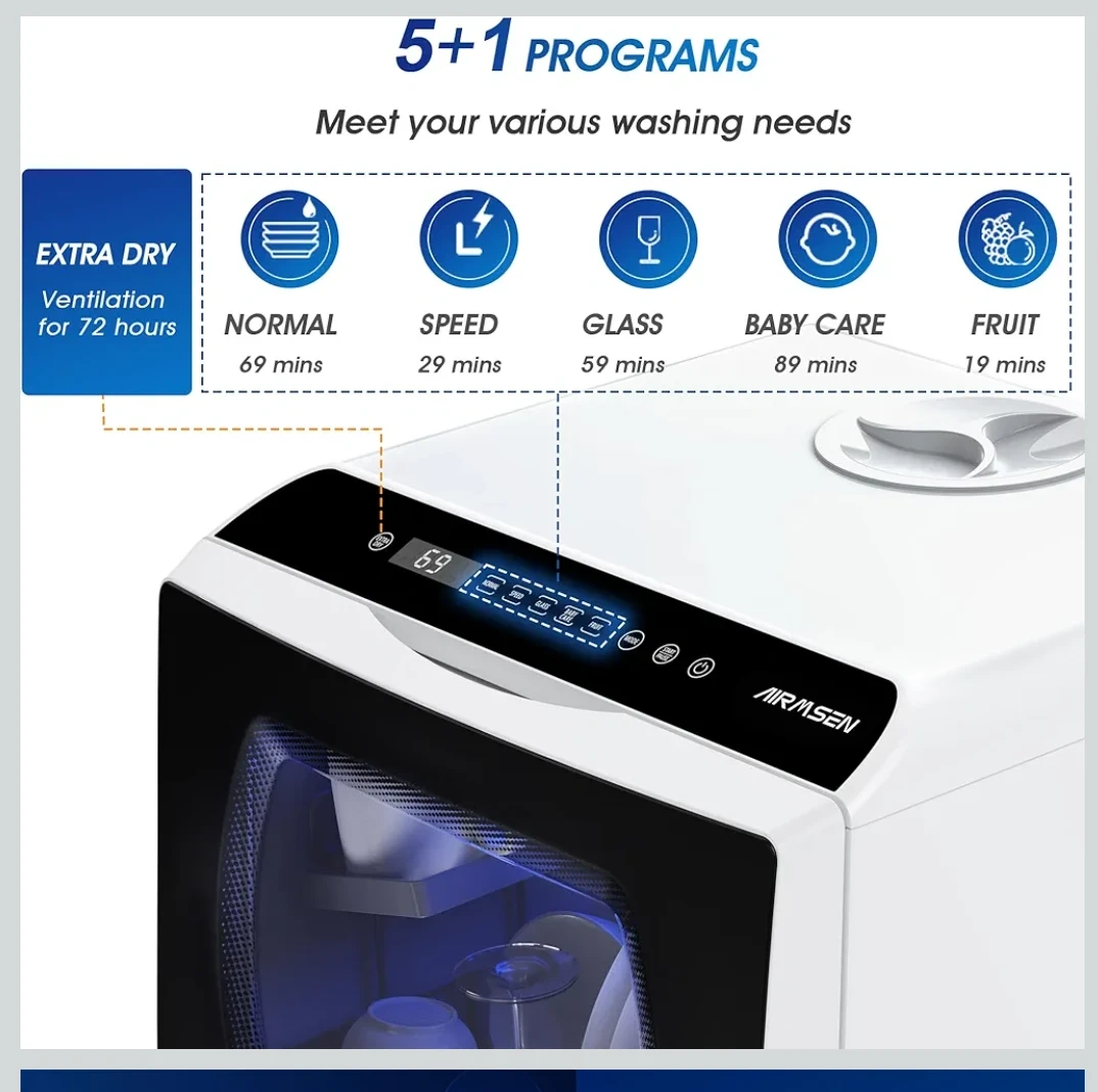 AIRMSEN TDQR03 Countertop Portable Dishwasher, Compact Mini Dishwasher with 5-Liter Built-in Water Tank and Air-Dry Function, 5 Washing Programs, Baby Care, Glass & Fruit Wash-White/Black