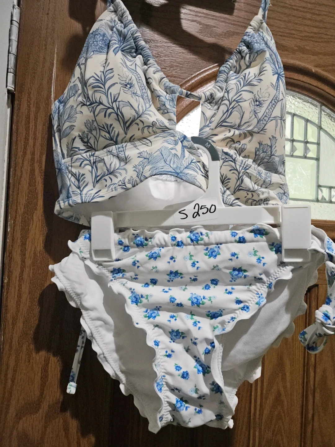 Shade & Shore/Wild Fable bikini set with a blue floral print on white. Features a halter-style top and ruffled bikini bottoms. Size small. Mix n match