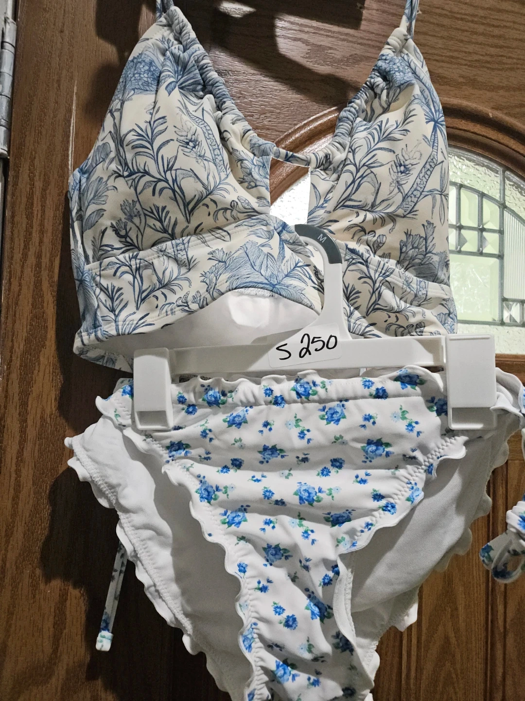 Shade & Shore/Wild Fable bikini set with a blue floral print on white. Features a halter-style top and ruffled bikini bottoms. Size small. Mix n match