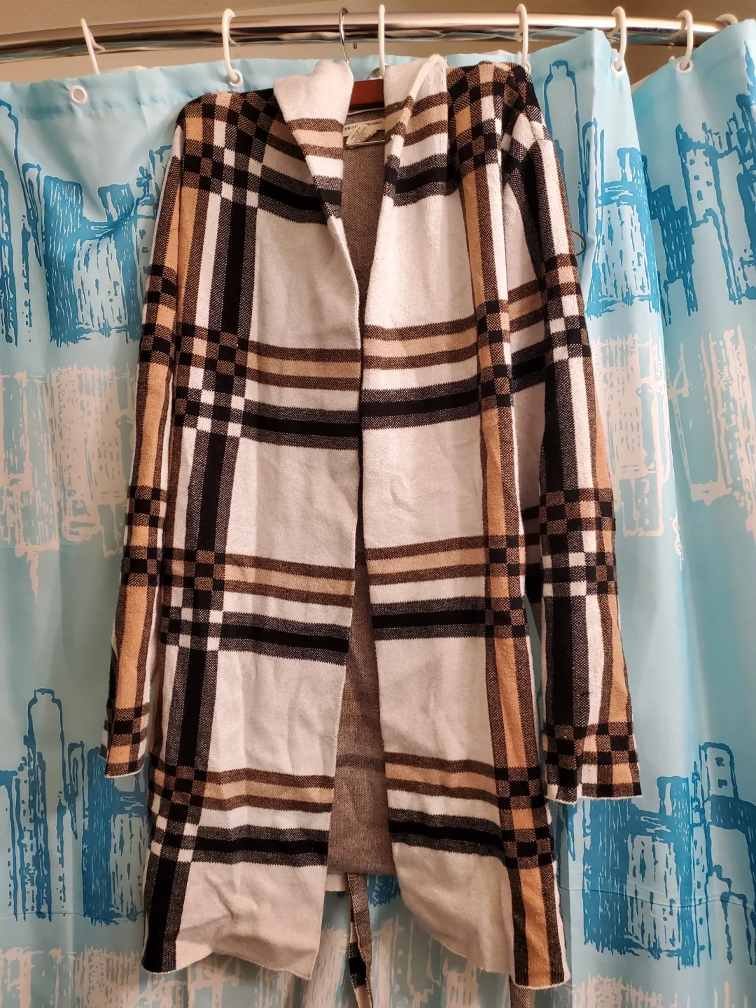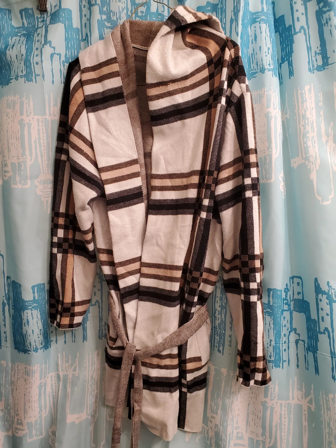 Cozy hooded cardigan with a classic plaid pattern. It features a tie belt for a cinched waist. Great for staying warm on chilly days! Hardly Worn. Closet Hung. Cedar pick up only. Xlarge.