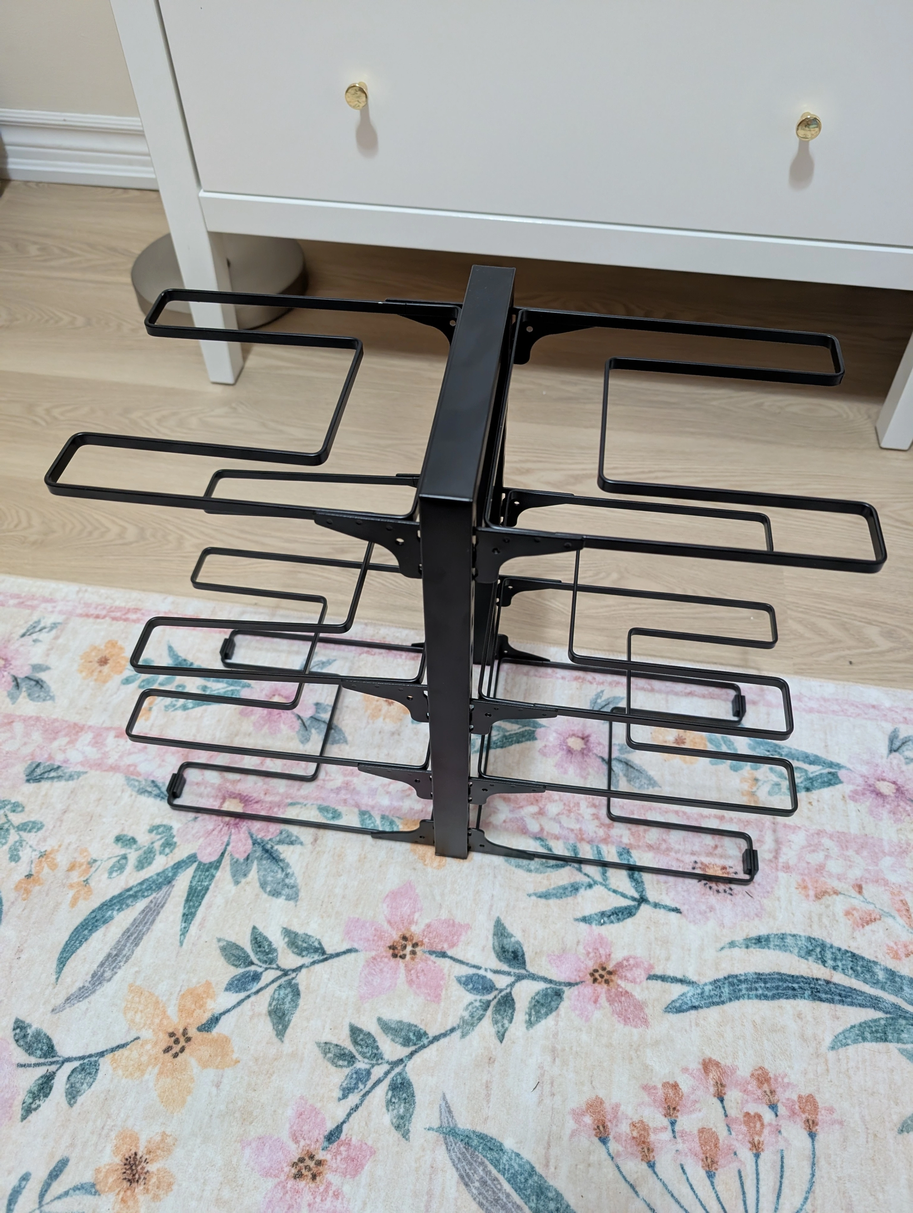 Selling a brand new pot and pan rack organizer! It's perfect for keeping your cookware neat and tidy. This rack is designed to fit inside a cabinet, on a countertop, or even on the floor. It measures approximately 17 3/4 inches in height and 25 1/4 inches in width, so make sure it fits your space!