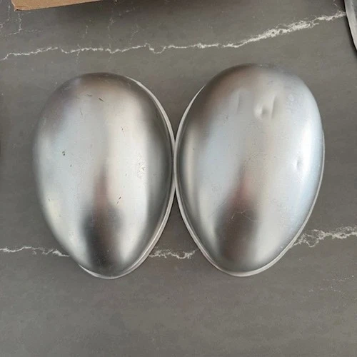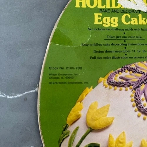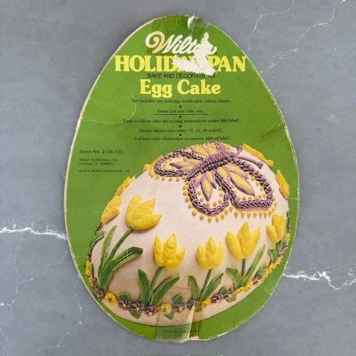 Offered for sale is a vintage Wilton Easter Egg cake pan set, Stock No. 2105-700, copyright 1976 by Wilton Enterprises, Inc., Chicago, IL. This classic aluminum mold includes two egg-shaped halves designed to create a 3D Easter egg cake. A wonderful piece of retro holiday bakeware, perfect for collectors or for creating nostalgic Easter desserts. Good vintage condition. Light surface wear and minor scratches consistent with age and normal use. A few small dings visible (see photos). No cracks, splits, or major warping. Clean interior surfaces. The original printed insert is included. It shows visible wear and tape repair from age and storage but remains intact and readable. Please review all photos carefully as they form part of the description. Details: Manufacturer: Wilton Enterprises, Inc. Stock Number: 2105-700 Copyright: 1976 Material: Aluminum Includes: Two cake pan halves and original insert. A charming vintage baking mold that would make a great addition to any retro kitchen collection or holiday baking tradition.