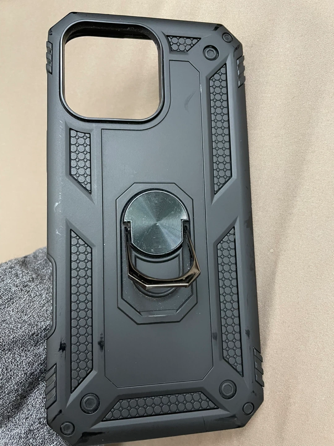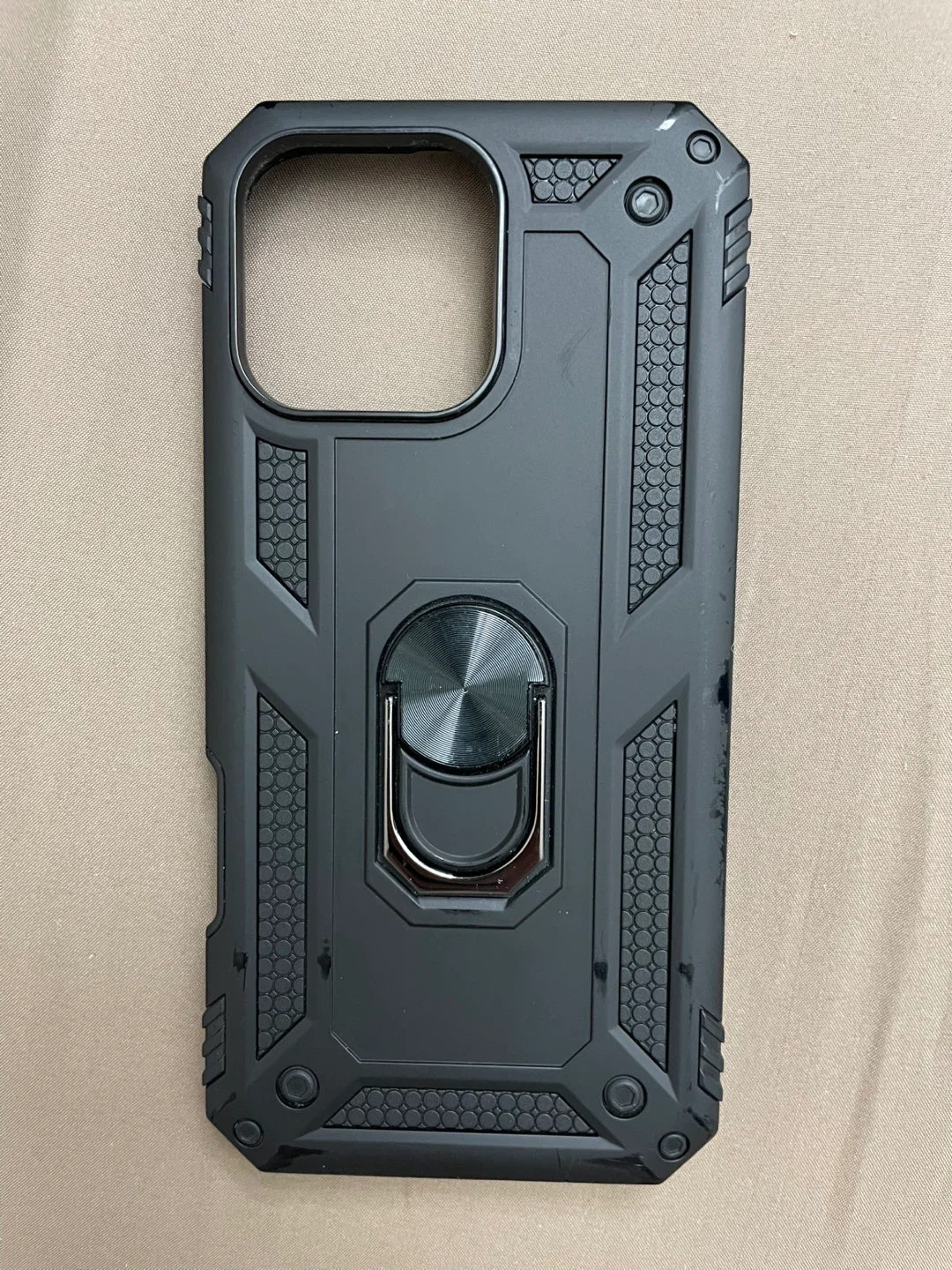 This protective phone case is black and comes with a built-in ring kickstand. It offers enhanced grip and protection for your device. The case also features angle adjustment for the kickstand.