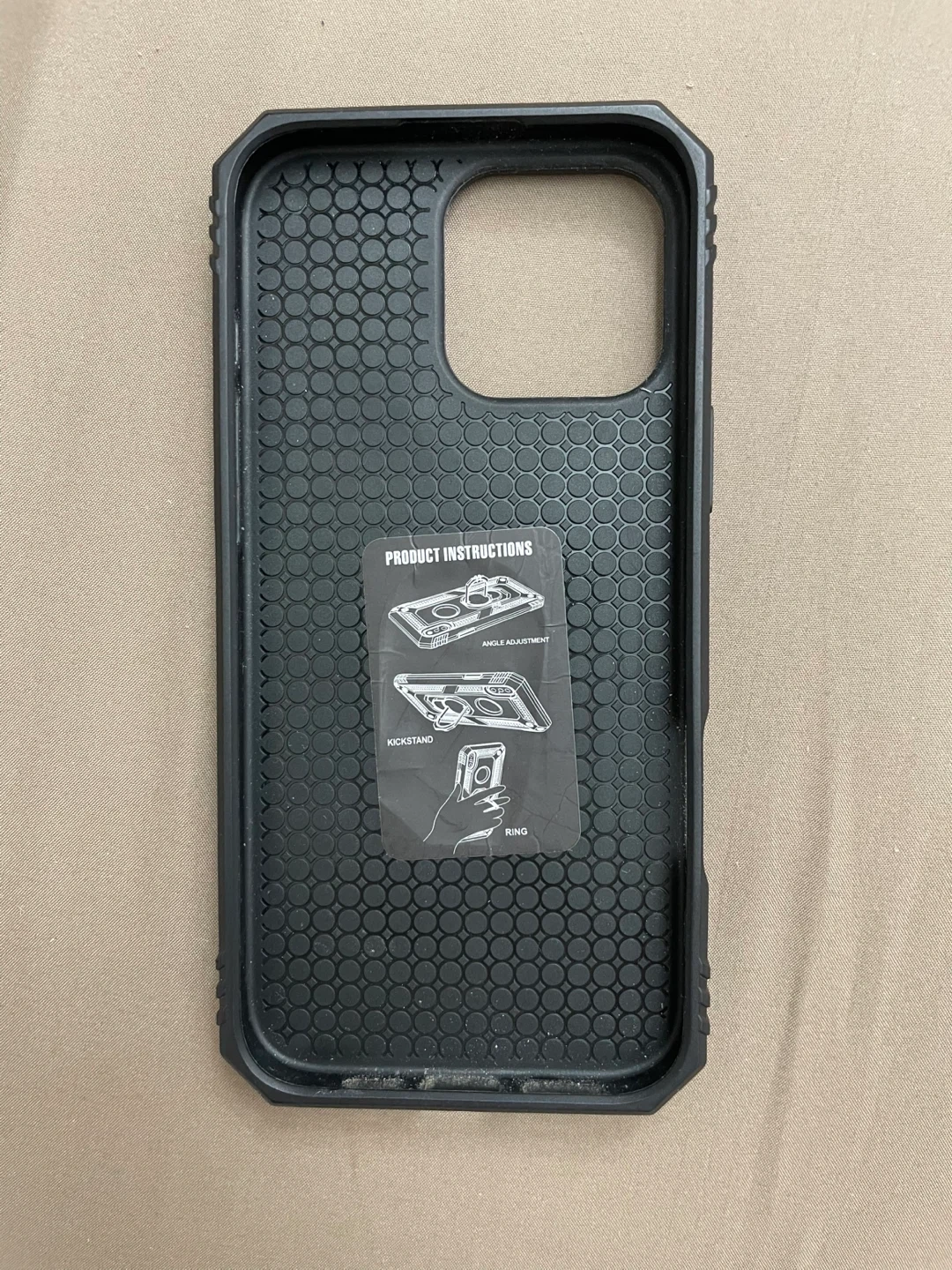 This protective phone case is black and comes with a built-in ring kickstand. It offers enhanced grip and protection for your device. The case also features angle adjustment for the kickstand.