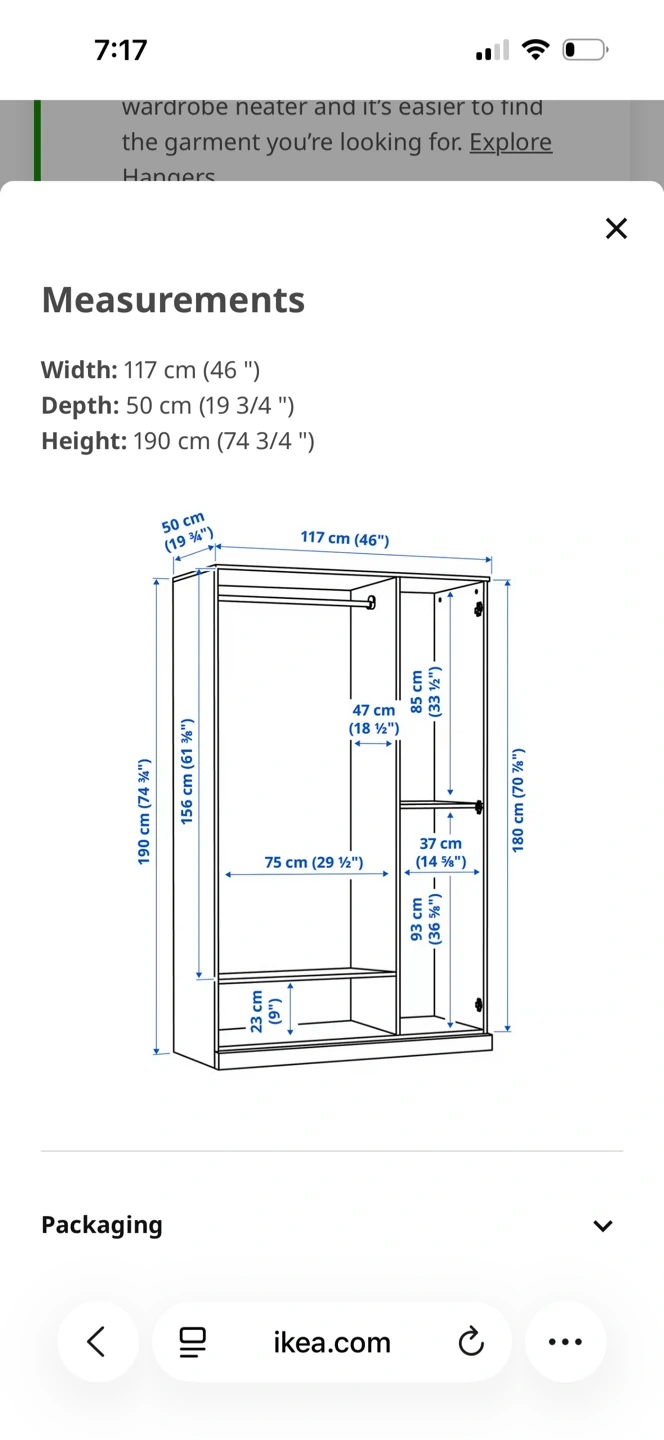 Black IKEA wardrobe like new barely used - with three doors and a full-length mirror on one door. It's 117 cm wide and 190 cm tall. Features a hanging rail and shelves inside for storage.